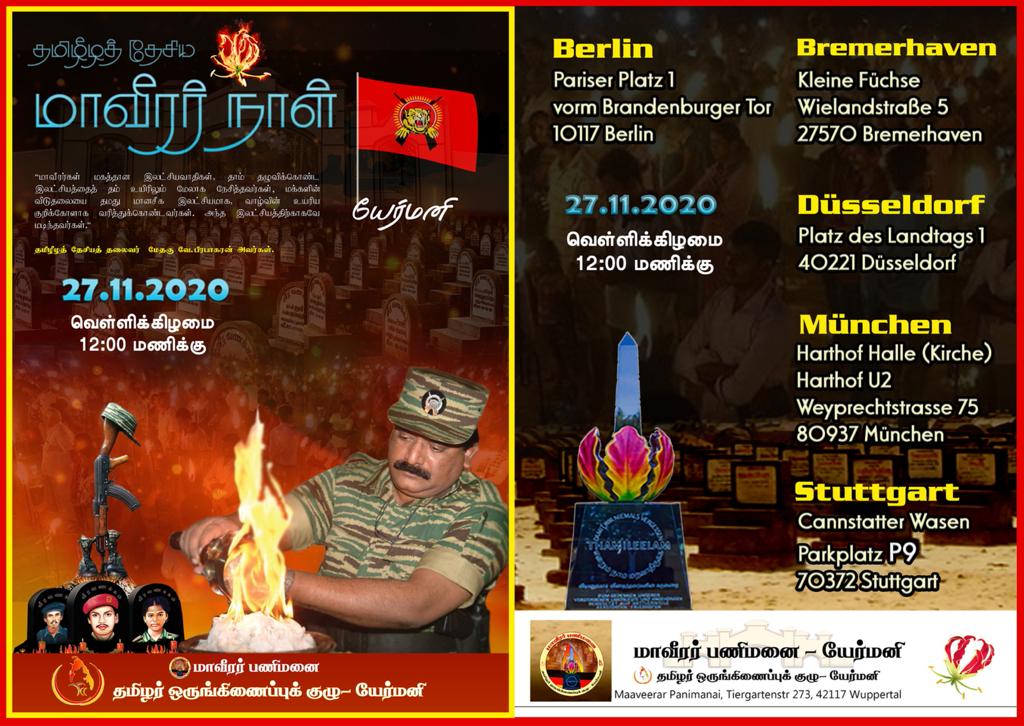 யேர்மனி ஸ்ருற்காட் நகரத்தில் நடைபெறவுள்ள மாவீரர் நாள் 2020 இல் அனைத்துத் தமிழ்மக்களையும் ஒன்றுகூடி மாவீரத் தெய்வங்களுக்கு விளக்கேற்றி மலர் தூவி வணக்கம் செலுத்த வருமாறு உரிமையுடன் அழைக்கின்றோம்.