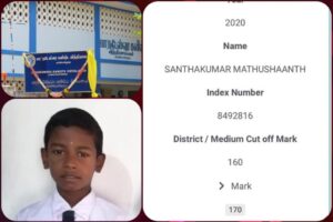 யாழ். வலிகாமம் வடக்கு காங்கேசந்துறை நடேஸ்வரா கனிஷ்ட வித்தியாலத்தின் சார்பில் மீள்குடியேற்றத்தின் பின்னர் 5ம் தரம் புலமைப்பரிசில் பரீட்சையில் சித்திபெற்ற முதலாவது மாணவன் என்ற சாதனையை மயிலிட்டியைச் சேர்ந்த சா.மதுஷாந்த் படைத்துள்ளார்.