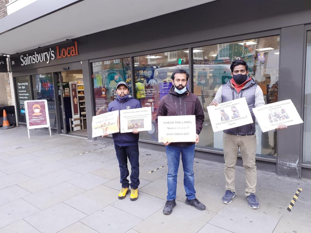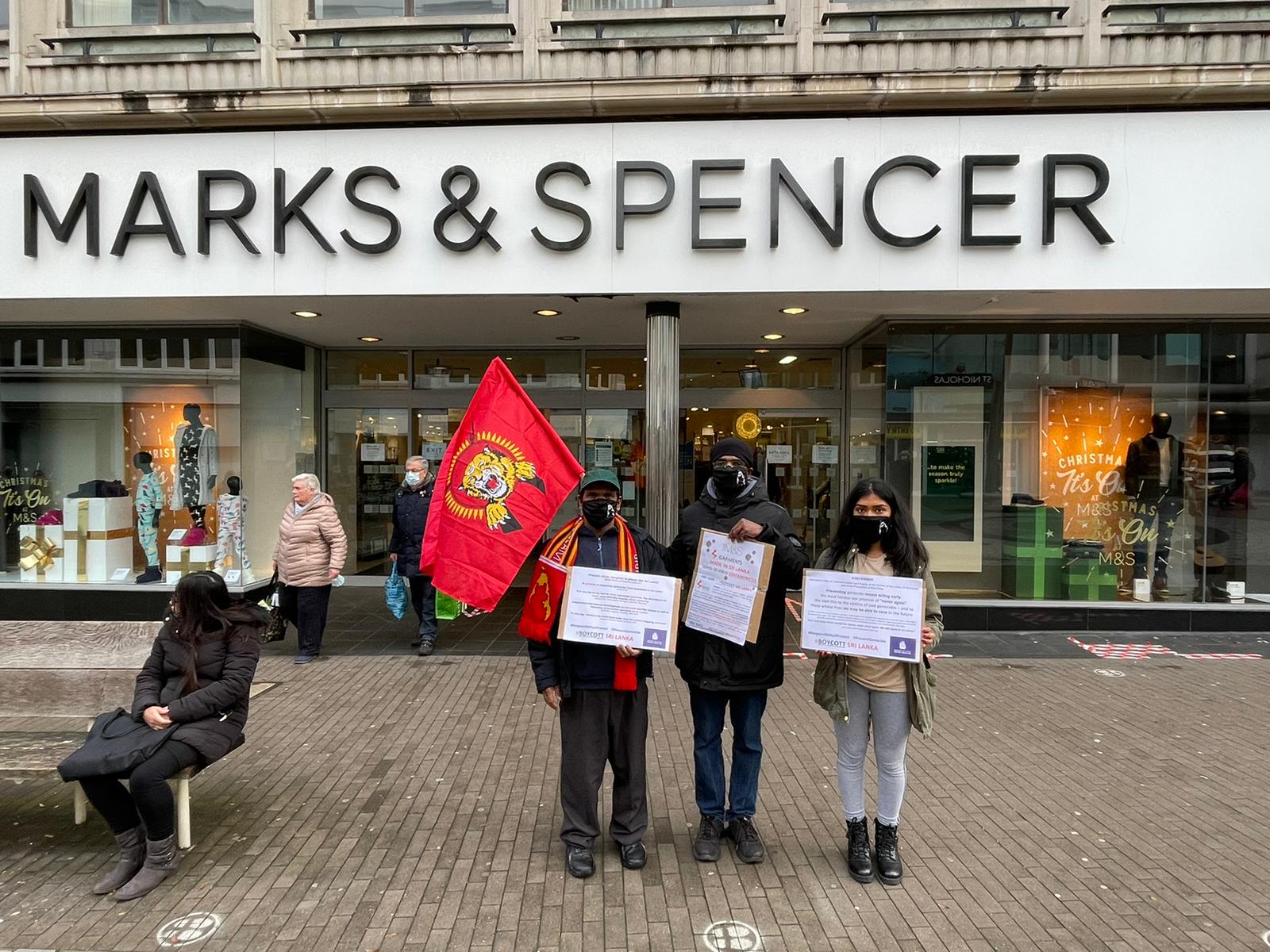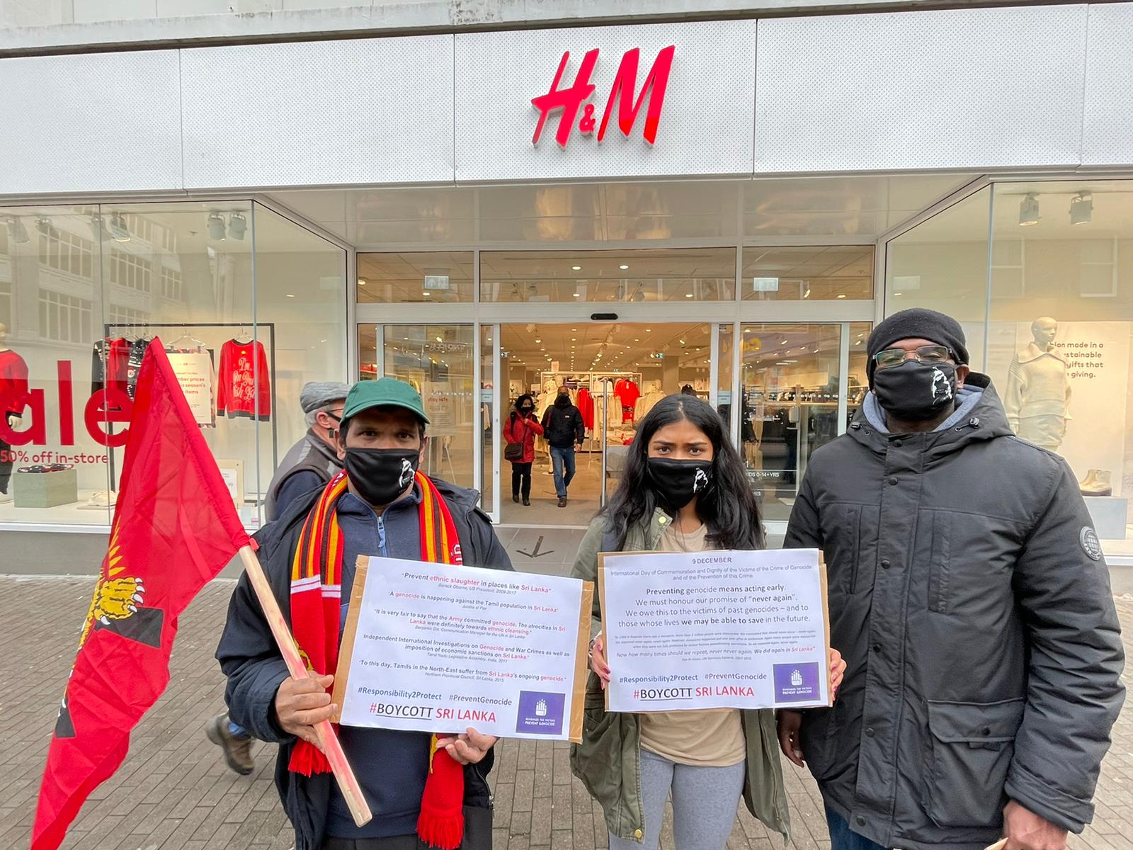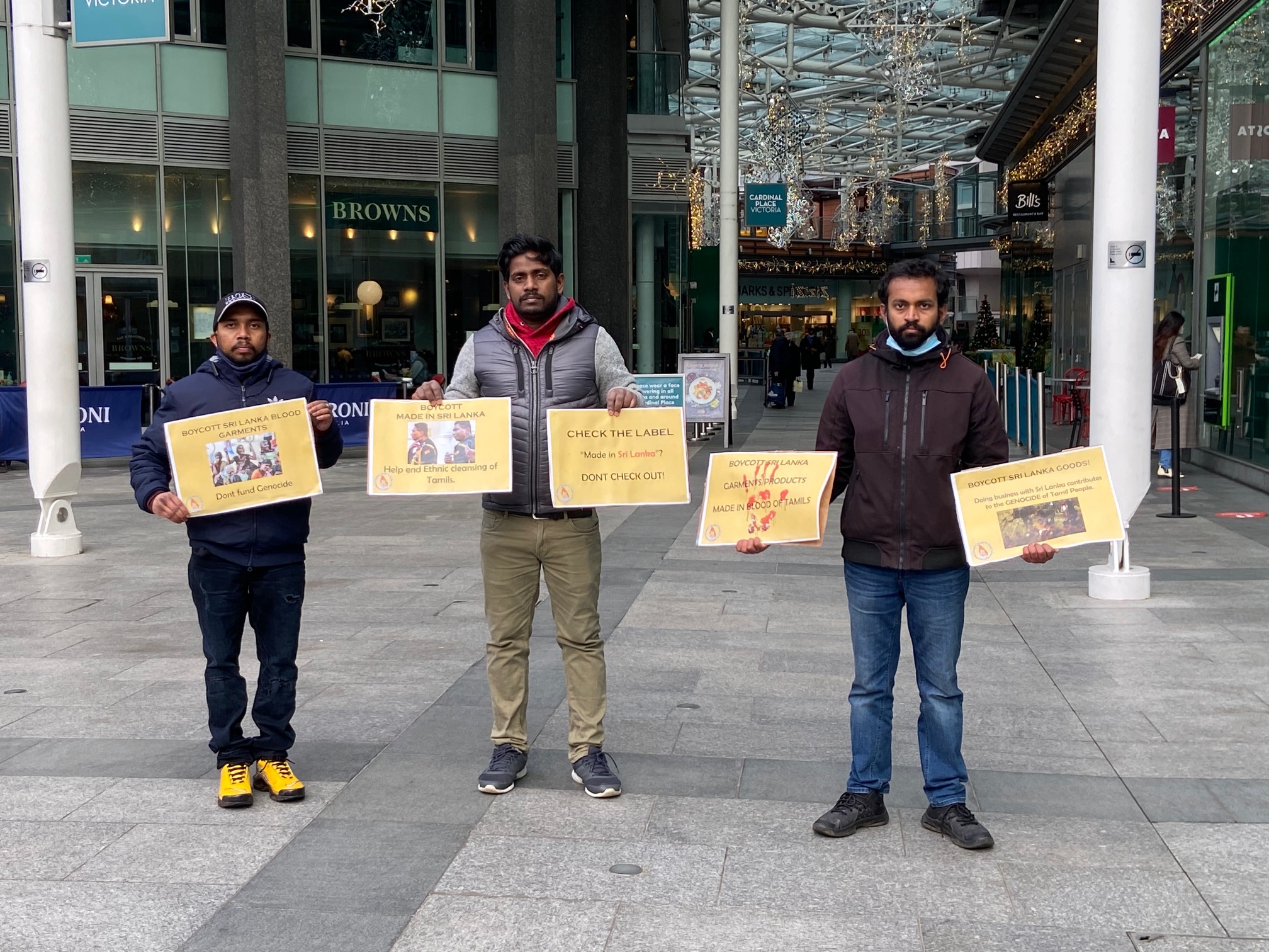 Marks & Spencer, NEXT, Tesco, ASDA, Sainsbury’s, Waitrose, Victoria’s Secret, H&M போன்ற நிறுவனங்கள் பாரிய அளவில் சிறிலங்காவில் உற்பத்தி செய்யப்படும் ஆடைகளை விற்பனை செய்கின்றன. அவற்றின் பல கிளைகளின் வெளியே சிறிலங்காவின் இனஅழிப்பு பற்றிய தகவல்கள் தாங்கிய சுலோக அட்டைகளுடன் நின்ற பிரித்தானியத் தமிழர்கள் அங்குவந்த வாடிக்கையாளர்களிடம் அது பற்றி விளக்கி, முடிந்தவரையில் அப்பொருட்களை வாங்குவதைத் தவிர்க்குமாறு கேட்டுக்கொண்டனர். அது மட்டுமல்லாமல் சிறிலங்கா உற்பத்திகளுக்குப் பதில் வேறு எவற்றை வாங்கலாம் என்ற அறிவுரைகளையும் வழங்கினர்.