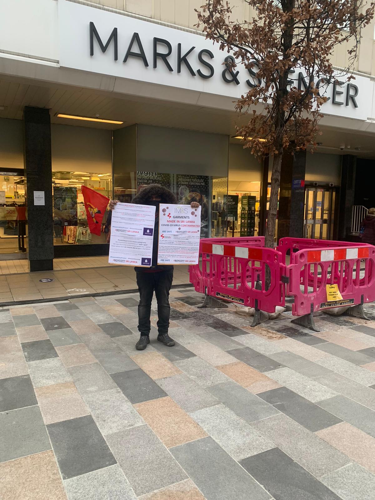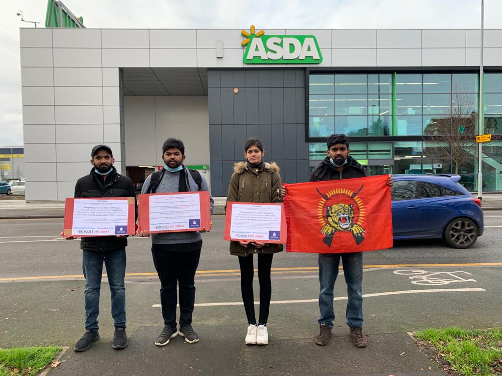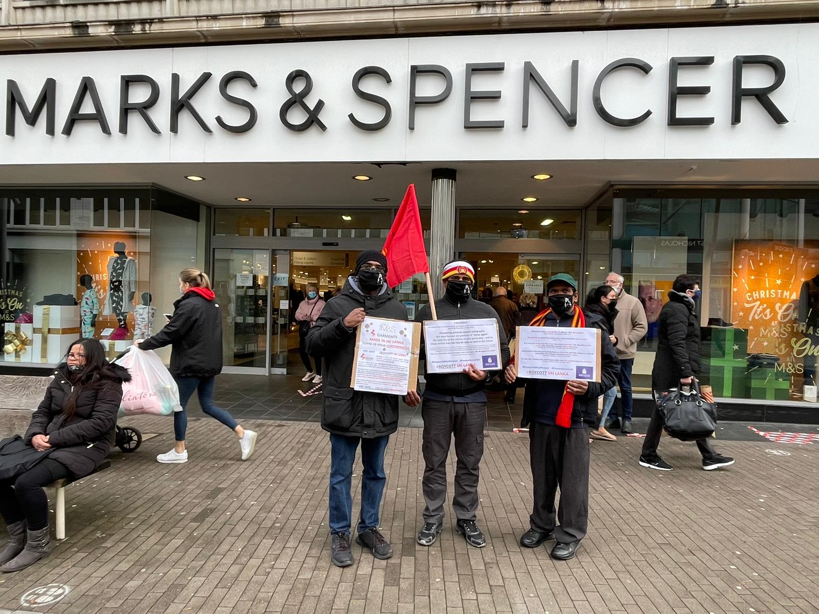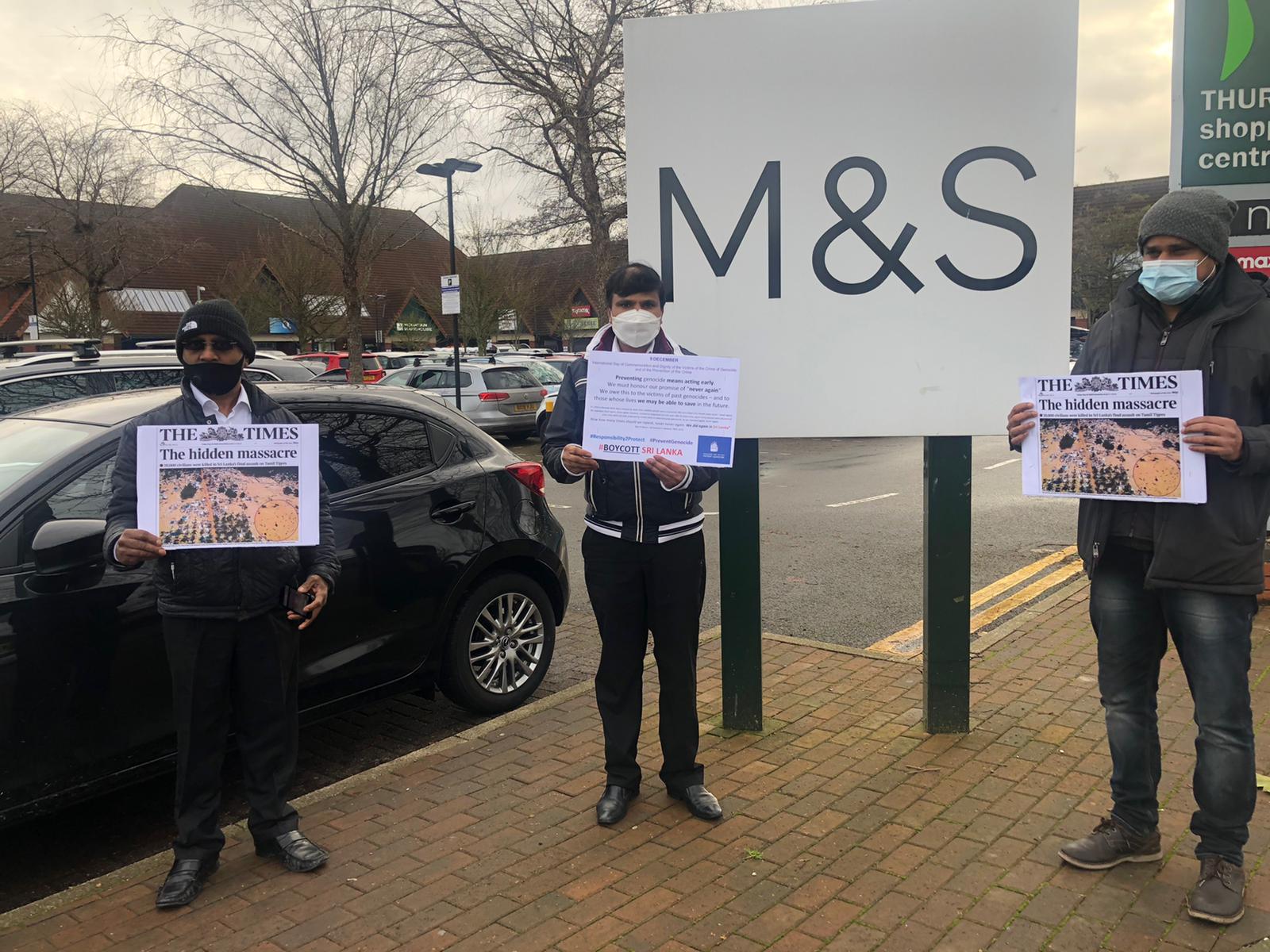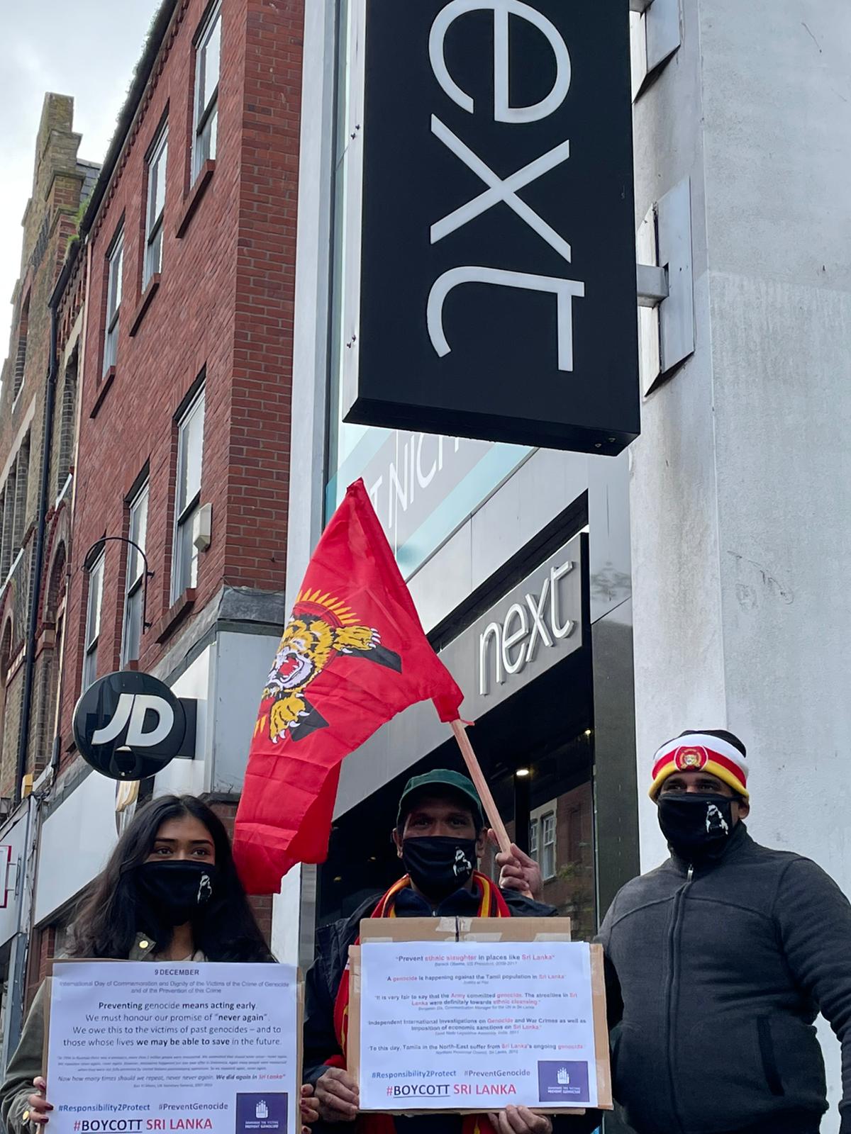 Marks & Spencer, NEXT, Tesco, ASDA, Sainsbury’s, Waitrose, Victoria’s Secret, H&M போன்ற நிறுவனங்கள் பாரிய அளவில் சிறிலங்காவில் உற்பத்தி செய்யப்படும் ஆடைகளை விற்பனை செய்கின்றன. அவற்றின் பல கிளைகளின் வெளியே சிறிலங்காவின் இனஅழிப்பு பற்றிய தகவல்கள் தாங்கிய சுலோக அட்டைகளுடன் நின்ற பிரித்தானியத் தமிழர்கள் அங்குவந்த வாடிக்கையாளர்களிடம் அது பற்றி விளக்கி, முடிந்தவரையில் அப்பொருட்களை வாங்குவதைத் தவிர்க்குமாறு கேட்டுக்கொண்டனர். அது மட்டுமல்லாமல் சிறிலங்கா உற்பத்திகளுக்குப் பதில் வேறு எவற்றை வாங்கலாம் என்ற அறிவுரைகளையும் வழங்கினர்.