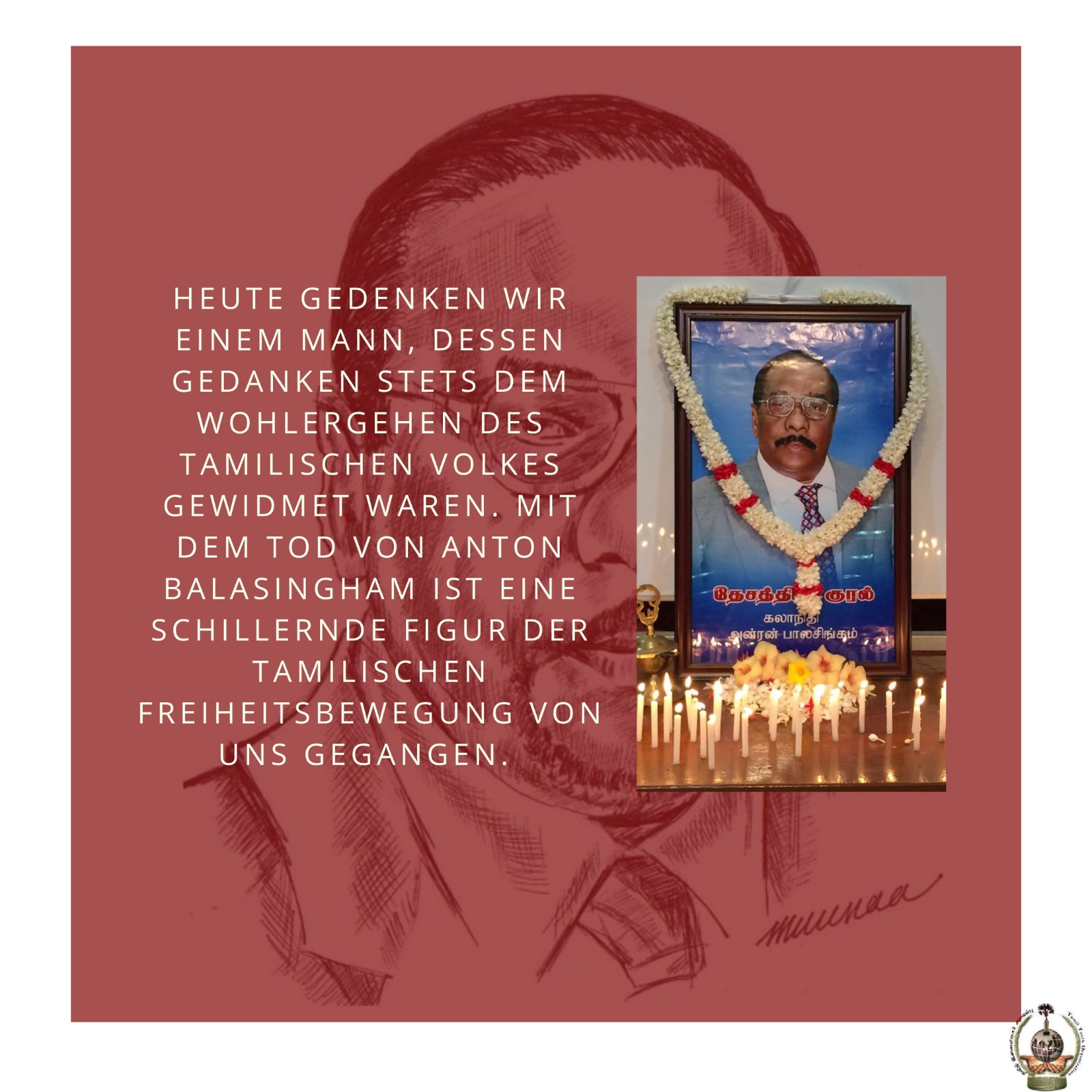 இன்று நாங்கள் எப்பொழுதும் தமிழ் மக்களுடைய நலனை சிந்திக்கும் மனிதரை நினைவு கூருகின்றோம். அன்ரன் பாலசிங்கத்தின் மறைவினால் இயக்கத்தினுடைய ஒரு முக்கிய ஆழுமை இல்லாமல் போனது.