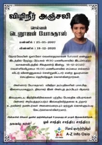 நோர்வேயின் ஒஸ்லோ வெஸ்தெரகாகன் furuset என்னும் இடத்தில் நேற்று பிற்பகல் 18;30 மணியளவில் இடம்பெற்ற வாகனவிபத்தில் செல்வன் டெனூஜன் யோகதாஸ் வயது(13) பலியானார்.