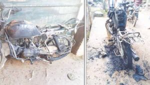 இந்தநிலையில் இவர்கள் 4 பேரும் நேற்று முன்தினம் இரவு வழக்கம்போல் வேலை முடிந்து வீட்டுக்கு வந்தனா். பின்னர், தங்கள் மோட்டார் சைக்கிளை தங்களது வீட்டின் முன் நிறுத்திவிட்டு தூங்கச்சென்றனர். நேற்று காலை எழுந்து பார்த்தபோது இவர்கள் 4 பேரின் மோட்டார் சைக்கிள்கள் தீவைத்து எரிக்கப்பட்டிருந்தன.