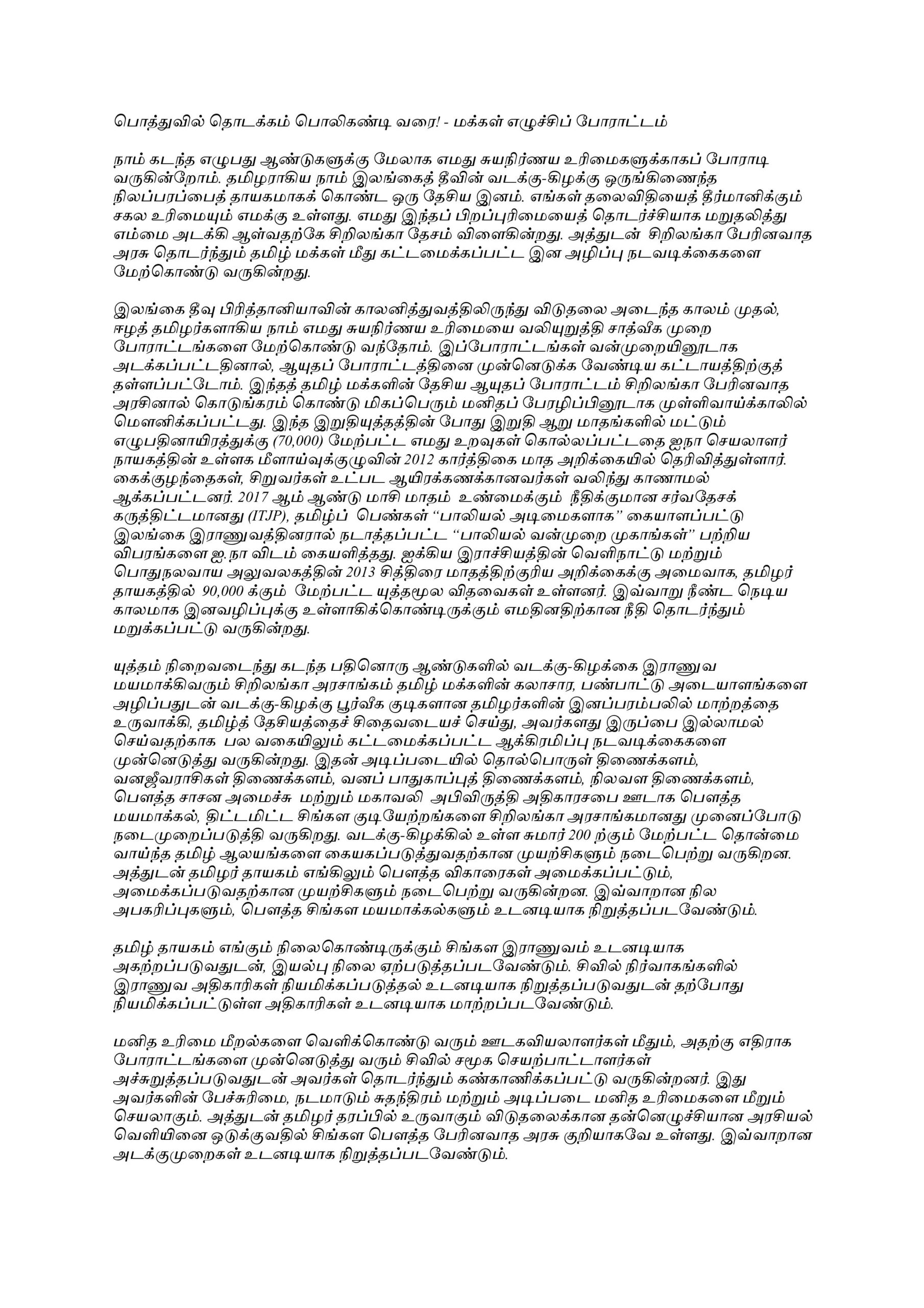தமிழ் மக்கள் அன்றாடம் எதிர்கொள்ளும் பிரச்னைகள், கொரோனா வைரஸ் தொற்றால் உயிரிழக்கும் முஸ்லிம்களின்உடல்களை அடக்கம் செய்ய அனுமதிக்க வேண்டும், மலையகப் பெருந்தோட்டத் தொழிலாளர்களின் நாளாந்த வேதனத்தை ஆயிரம் ரூபாவாகஅதிகரிக்க வேண்டும் போன்ற கோரிக்கைகளை முன்வைத்து கடந்த 3ஆம் திகதி கிழக்கு மாகாணம் அம்பாறை மாவட்டம் பொத்துவிலிலிருந்து யாழ்ப்பாணம் மாவட்டம் பொலிகண்டியை நோக்கிய பேரணி ஏற்பாடு செய்யப்பட்டது.