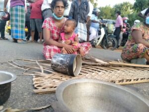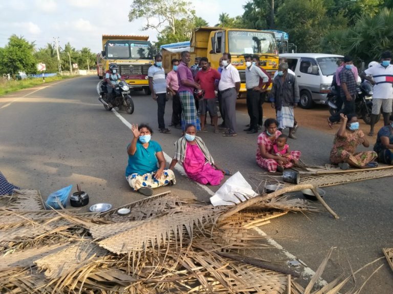 அதனை அடுத்து, பொலிசாரால் மற்றும் தென்னை தென்னை பயிர்ச்செய்கை சபையிரால் புடுங்கப்பட்ட கொட்டகைகளை மற்றும் தூக்கி வீசப்பட்ட வீட்டு பாத்திரங்களை கரந்தாய் ஏ9 வீதியில் போட்டு வீதியை மறித்து போராட்டத்தினை மக்கள் முன்னெடுத்தனர்.