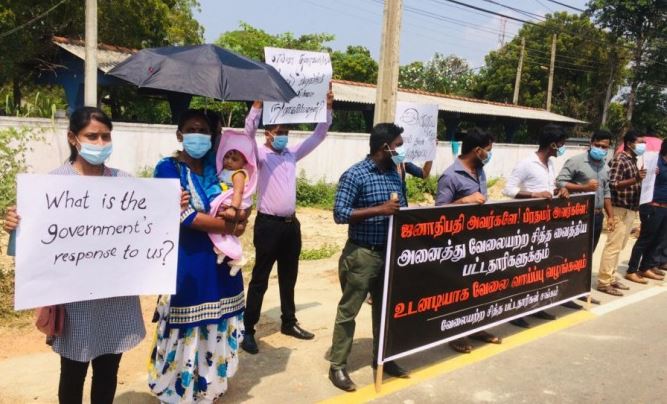 குறித்து போராட்டம், இன்று நண்பகல் 12.30 மணி அளவில் யாழ்ப்பாணம் கைதடியில் இடம்பெற்றது. சித்தமருத்துவத் துறையில், பட்டப்படிப்பினை முடித்தும், கடந்த நான்கு வருடங்களாக தாம் பட்டதாரி நியமனங்களுக்குள் உள்வாங்கப்படவில்லைனெத் தெரிவித்துள்ளனர்.