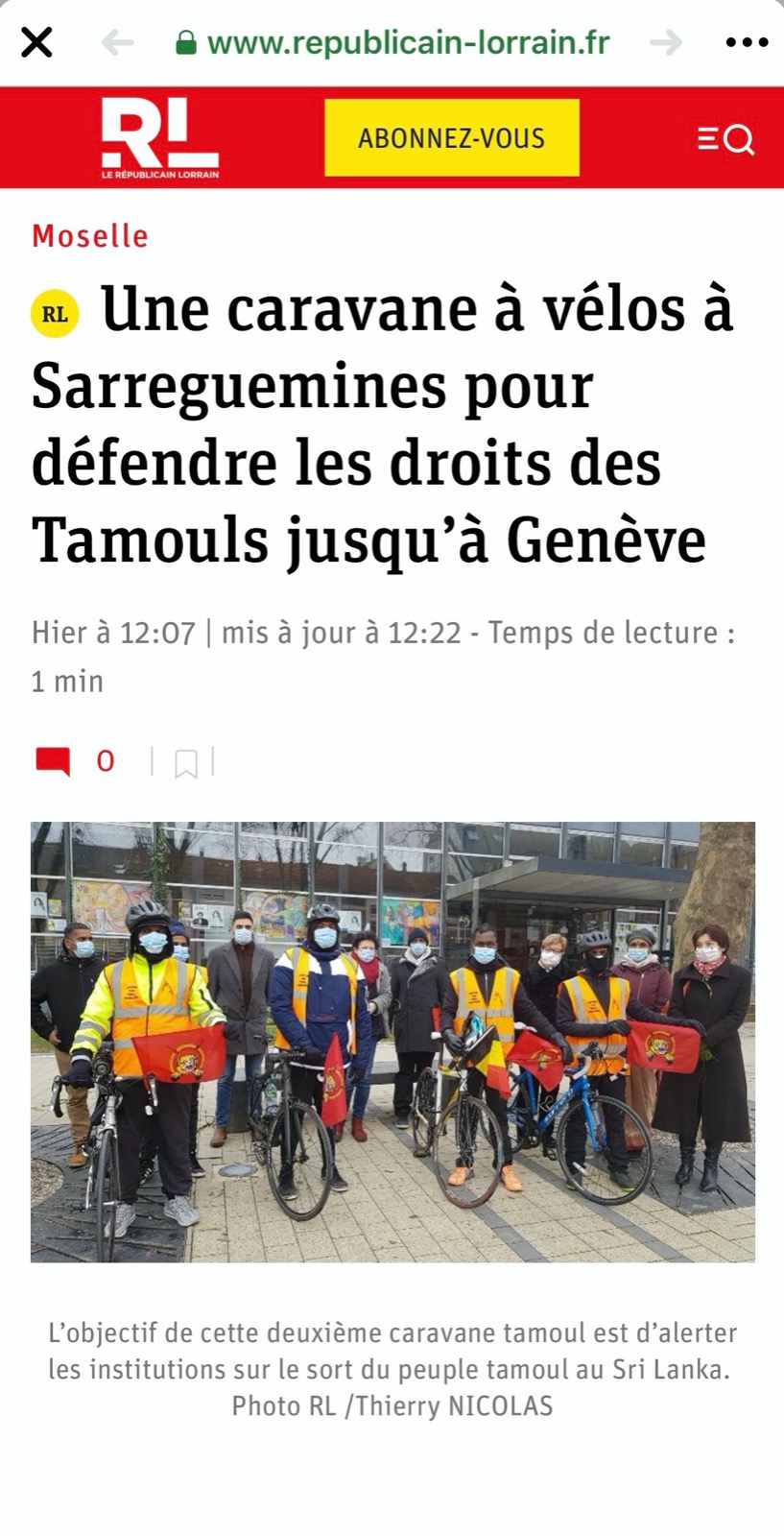 நேற்றைய் தினம் (15.02.2021) Saargumine மாநகரசபையில் இடம் பெற்ற சந்திப்பினை “Ville de sarregumine” எனும் முகநூல் பக்கத்திலும் Saargumine மாநகரசபை பதிவு செய்திருந்தார்கள். மற்றும் « Rebublicain Lorraine » எனும் பத்திரிகை ஊடகமும் மனிதநேய ஈருருளிப்பயண அறவழிப்போராட்டத்திற்கு முக்கியத்துவம் கொடுத்தது என்பது குறிப்பிடத்தக்கது.