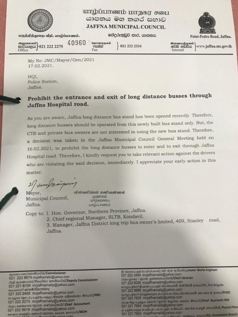 இம் முடிவானது யாழ்ப்பாணம் போக்குவரத்து போலீசாருக்கும் அறிவித்து இதனை மீறுபவர்கள் மீது உடனடியாக சட்ட நடவடிக்கை எடுக்குமாறு அறிவுறுத்தப்பட்டுள்ளது. குறித்த பேருந்துகள் வைத்திய சாலை வீதியை பயன்படுத்துவது தடை செய்யப்பட்டால் யாழ் நகரின் போக்குவரத்து நெரிசல் பெருமளவில் குறைவடையும். எனவே அனைவரினதும் ஒத்துழைப்பை இது தொடர்பில் வேண்டி நிற்கின்றேன். யாழ்ப்பாண மாநகர முதல்வரால் தெரிவிக்கப்பட்டுள்ளது