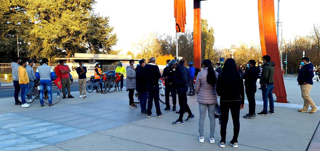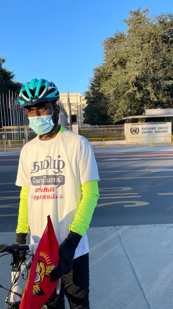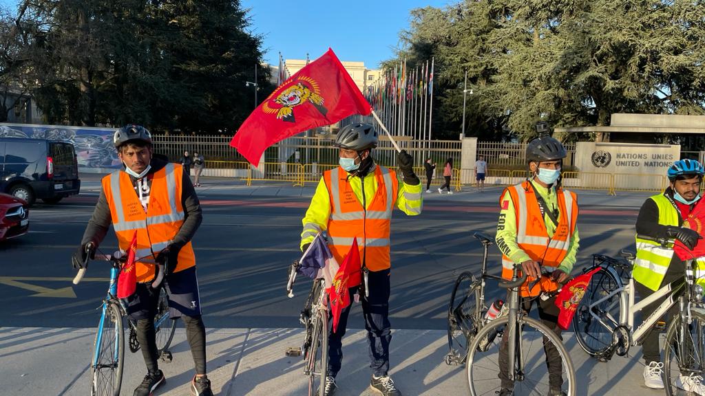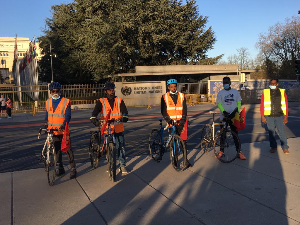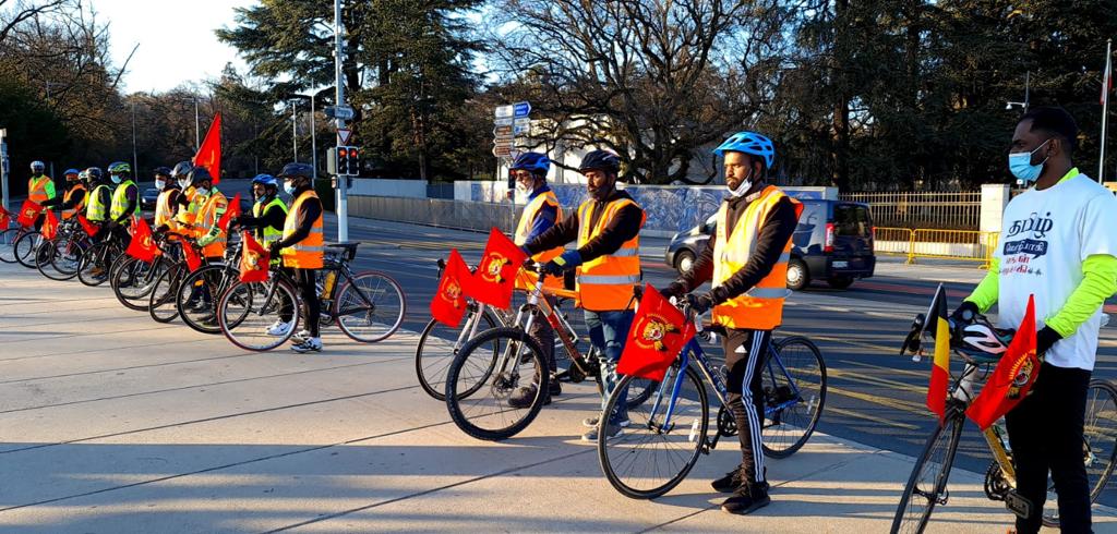 08.02.2021 அன்று நெதர்லாந்தில் அமைந்துள்ள அனைத்துலக குற்றவியல் நீதிமன்றத்தின் முன் இருந்து ஆரம்பிக்கப்பட்ட மனித நேய ஈருருளிப்பயணம் பெல்சியம், லக்சாம்பூர்க், யேர்மனி மற்றும் பிரான்சு நாடுகளை ஊடறுத்து இன்று 21.02.2021, 1500 Km கடந்து பல அரசியற் சந்திப்பினூடாக நாம் வாழும் நாடுகளினை இலக்கு வைத்து எமது நியாயமான கோரிக்கையினை ஐக்கிய நாடுகள் அவையில் 46வது மனித உரிமைகள் ஆணைக்குழுவில் வலியுறுத்த வேண்டும் எனும் வேணவாவோடு ஈகைப்பேரொளி முருகாதசன் திடலினை (ஐ.நா முன்றலில் ) பெரும் எழுச்சியோடு வந்தடைந்தது.