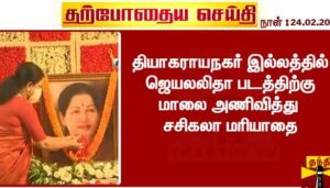 மறைந்த முன்னாள் முதல்வர் ஜெயலலிதாவின் 73-வது பிறந்தநாள் இன்று கொண்டாடப்படுகிறது. இதையொட்டி தி.நகரில் உள்ள இல்லத்தில் ஜெயலலிதாவின் உருவப்படத்திற்கு சசிகலா மாலை அணிவித்து மலர் தூவி மரியாதை செலுத்தினார். பின்னர் தொண்டர்களுக்கு இனிப்புகளை சசிகலா வழங்கினார்.