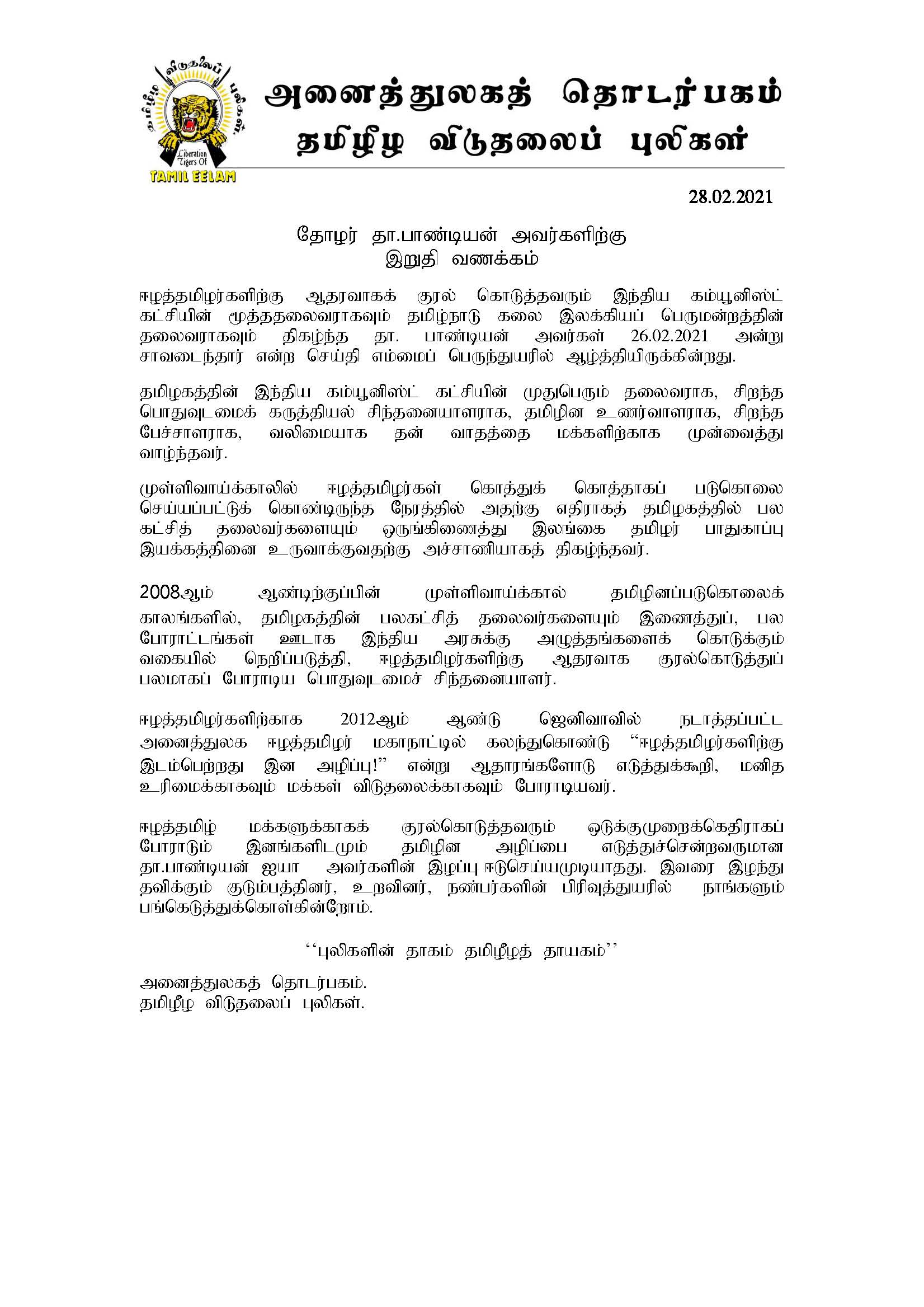 ஈழத்தமிழர்களிற்கு ஆதரவாகக் குரல் கொடுத்தவரும் இந்திய கம்யூனிஸ்ட் கட்சியின் மூத்ததலைவராகவும் தமிழ்நாடு கலை இலக்கியப் பெருமன்றத்தின் தலைவராகவும் திகழ்ந்த தா. பாண்டியன் அவர்கள் 26.02.2021 அன்று சாவடைந்தார் என்ற செய்தி எம்மைப் பெருந்துயரில் ஆழ்த்தியிருக்கின்றது.
