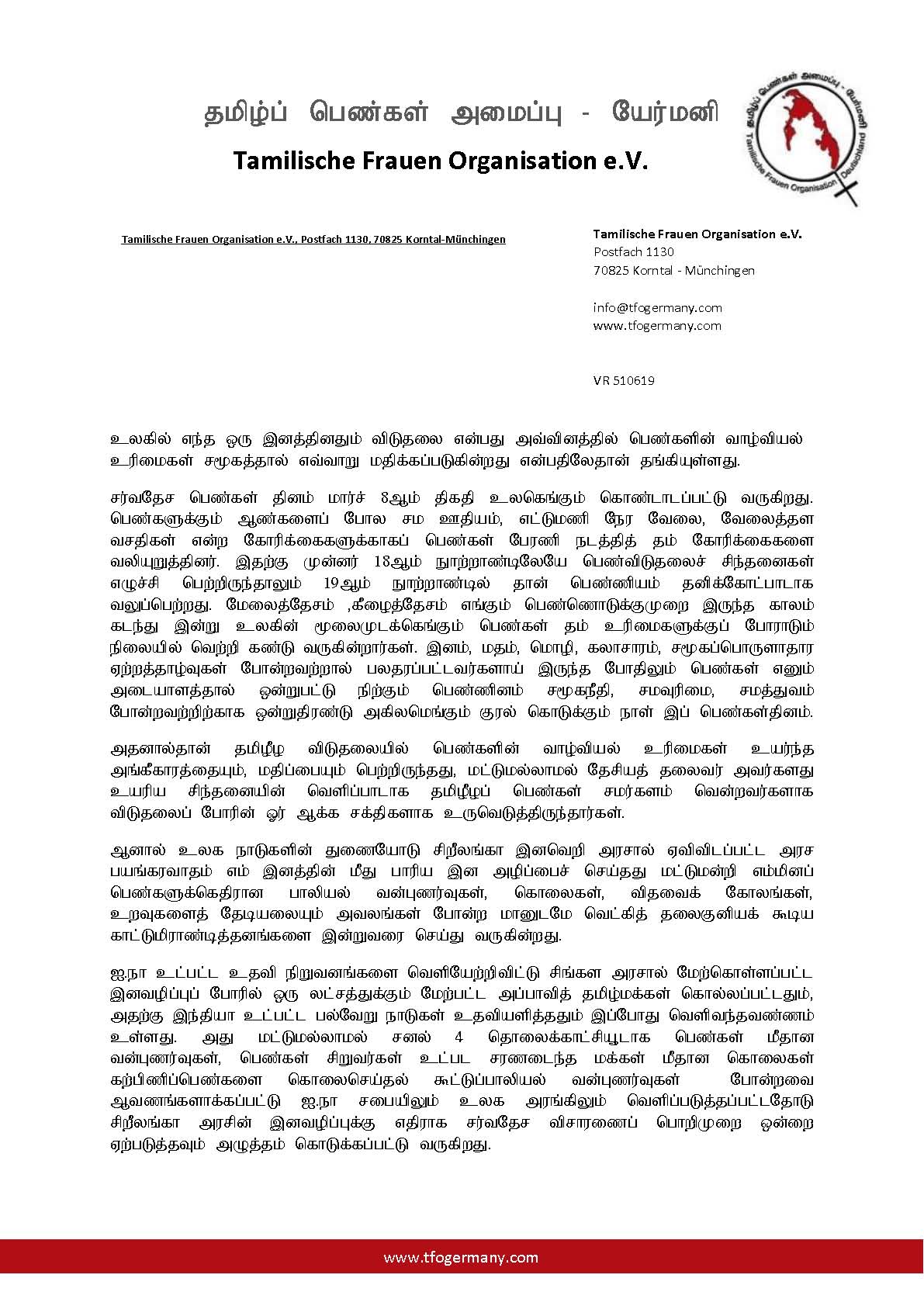 அன்பான உறவுகளே! தமிழ்ப் பெண்களாகிய நாங்கள் உலகப் பெண்ணினத்துக்கு ஓர் அரிய செய்தியை கூறுவோம். தமிழீழப்பெண்கள் எத்தகைய அடக்குமுறைக்கும் எதிராகக் குரல் கொடுக்கக் கூடியவர்கள் என்பதையும், ஓர் அறிவார்ந்த சமூகம் என்பதையும், உலகில் எங்கும் பெண்களுக்கு எதிரான வன்முறைகள் நடைபெற்றாலும் எதிர்த்துக் குரல் கொடுக்கக் கூடியவர்கள் என்பதையும் உணர்த்துவோம். தமிழ்ப் பெண்களாகிய எமது நிறைவான உரிமைகள் தமிழீழ விடுதலையுடன் கூடியதாகவே இருக்கின்றது என்ற உண்மையை உலகிற்கும், மானுடத்தை நேசிக்கும் அமைப்புகளுக்கும் புரியவைப்போம்.