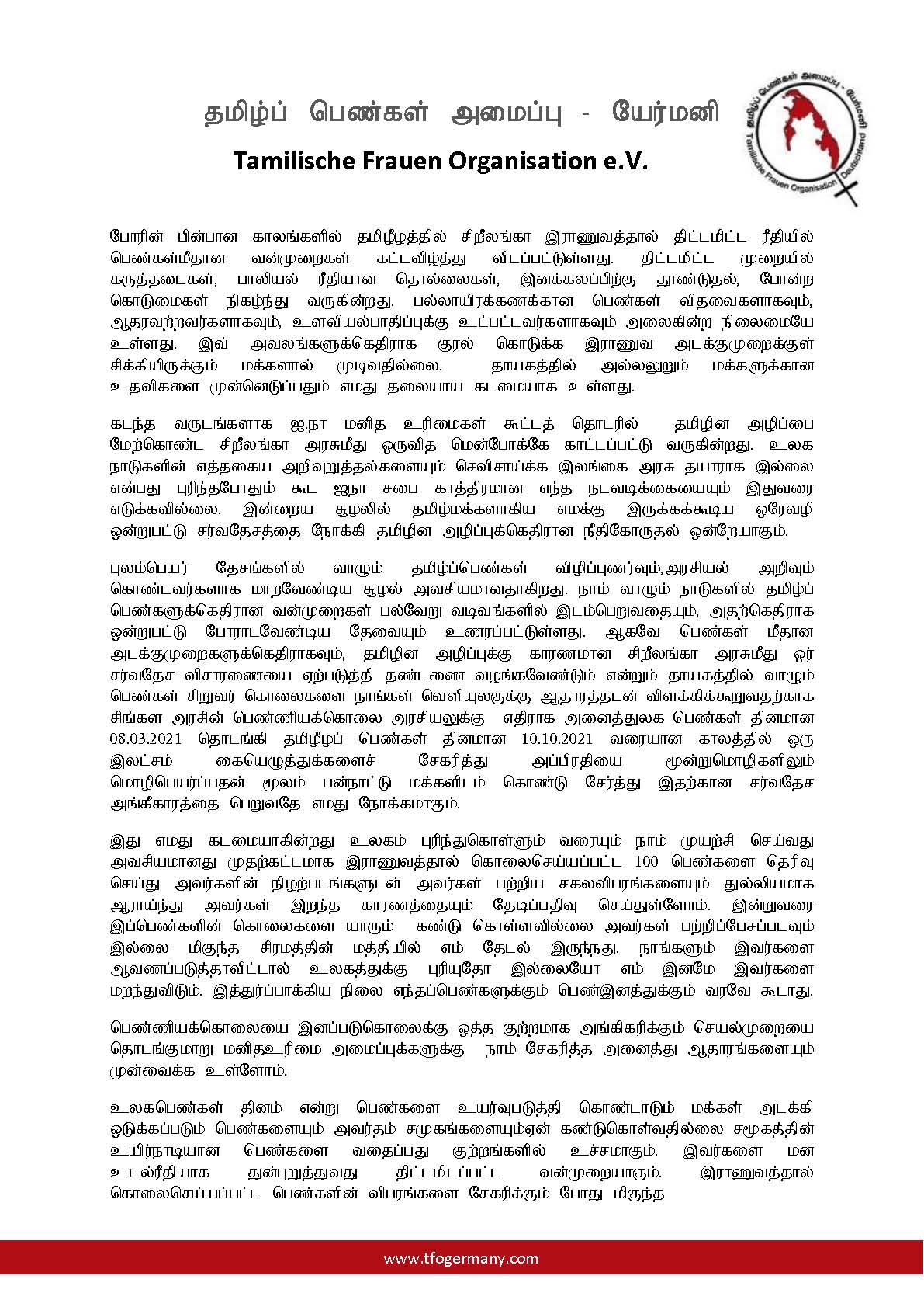 புலம்பெயர் தேசங்களில் வாழும் தமிழ்ப்பெண்கள் விழிப்புணர்வும்,அரசியல் அறிவும் கொண்டவர்களாக மாறவேண்டிய சூழல் அவசியமானதாகிறது. நாம் வாழும் நாடுகளில் தமிழ்ப் பெண்களுக்கெதிரான வன்முறைகள் பல்வேறு வடிவங்களில் இடம்பெறுவதையும், அதற்கெதிராக ஒன்றுபட்டு போராடவேண்டிய தேவையும் உணரப்பட்டுள்ளது. ஆகவே பெண்கள் மீதான அடக்குமுறைகளுக்கெதிராகவும், தமிழின அழிப்புக்கு காரணமான சிறீலங்கா அரசுமீது ஒர் சர்வதேச விசாரணையை ஏற்படுத்தி தண்டணை வழங்கவேண்டும் என்றும் தாயகத்தில் வாழும் பெண்கள் சிறுவர் கொலைகளை நாங்கள் வெளியுலகுக்கு ஆதாரத்தடன் விளக்கிக்கூறுவதற்காக சிங்கள அரசின் பெண்ணியக்கொலை அரசியலுக்கு எதிராக அனைத்துலக பெண்கள் தினமான 08.03.2021 தொடங்கி தமிழீழப் பெண்கள் தினமான 10.10.2021 வரையான காலத்தில் ஒரு இலட்சம் கையெழுத்துக்களைச் சேகரித்து அப்பிரதியை மூன்றுமொழிகளிலும் மொழிபெயர்ப்பதன் மூலம் பன்நாட்டு மக்களிடம் கொண்டு சேர்த்து இதற்கான சர்வதேச அங்கீகாரத்தை பெறுவதே எமது நோக்கமாகும்.