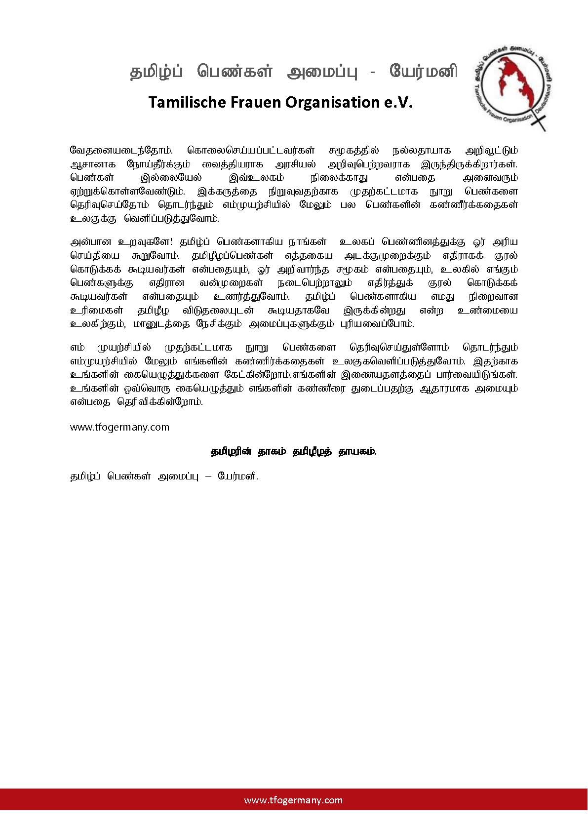 எம் முயற்சியில் முதற்கட்டமாக நூறு பெண்களை தெரிவுசெய்துள்ளோம் தொடர்ந்தும் எம்முயற்சியில் மேலும் எங்களின் கண்ணிர்க்கதைகள் உலகுகவெளிப்படுத்துவோம். இதற்காக உங்களின் கையெழுத்துக்களை கேட்கின்றோம்.எங்களின் இணையதளத்தைப் பார்வையிடுங்கள். உங்களின் ஒவ்வொரு கையெழுத்தும் எங்களின் கண்ணீரை துடைப்பதற்கு ஆதாரமாக அமையும் என்பதை தெரிவிக்கின்றோம்.