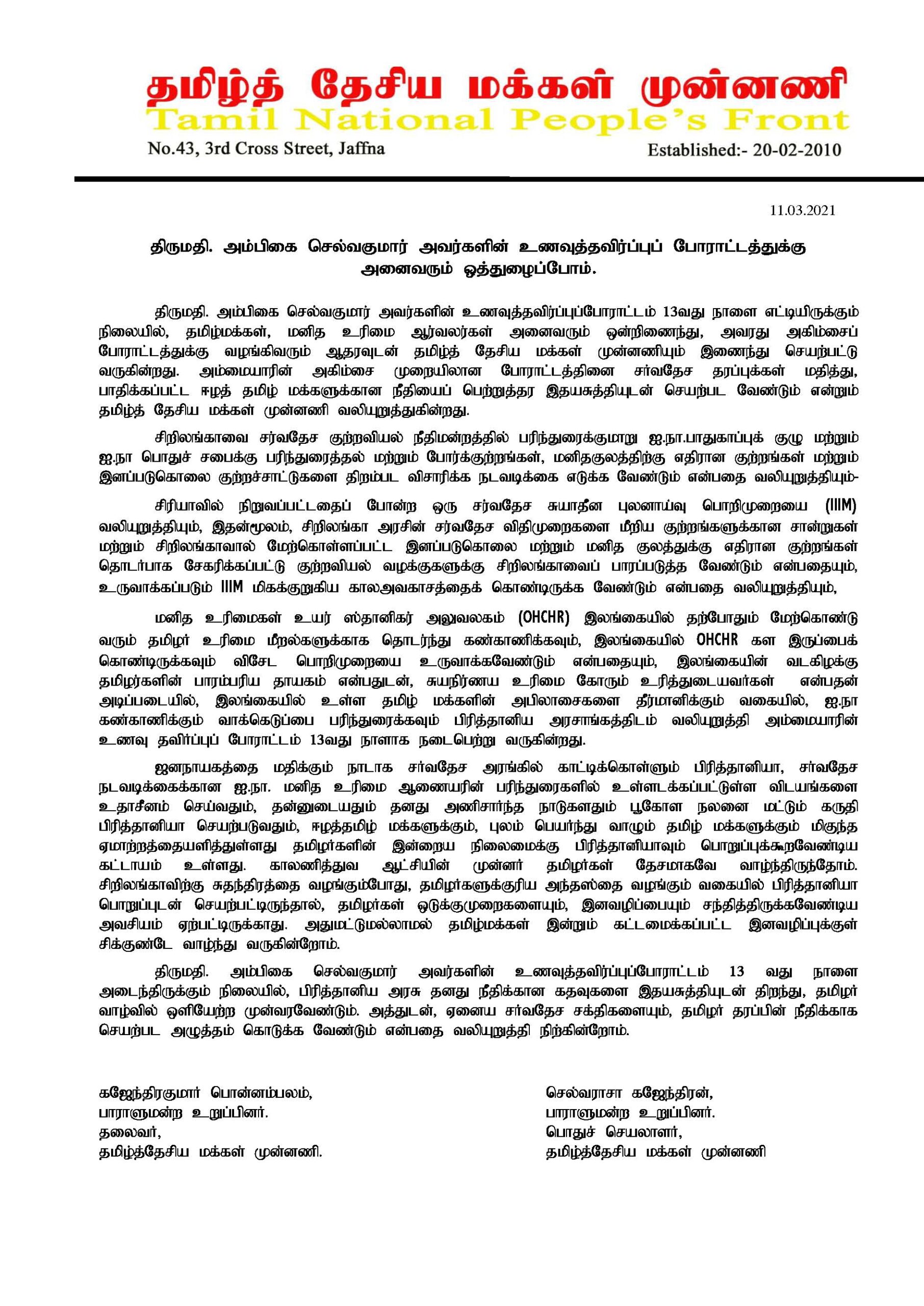 திருமதி. அம்பிகை செல்வகுமார் அவர்களின் உணவுத்தவிர்ப்புப்போராட்டம் 13வதுநாளை எட்டியிருக்கும்நிலையில், தமிழ்மக்கள், மனித உரிமை ஆர்வலர்கள் அனைவரும் ஒன்றிணைந்து, அவரது அகிம்சைப் போராட்டத்துக்கு வழங்கிவரும் ஆதரவுடன் தமிழ்த் தேசிய மக்கள் முன்னணியும் இணைந்து செயற்பட்டு வருகின்றது. அம்மையாரின் அகிம்சை முறையிலான போராட்டத்தினை சர்வதேச தரப்புக்கள் மதித்து, பாதிக்கப்பட்ட ஈழத் தமிழ் மக்களுக்கான நீதியைப் பெற்றுத்தர இதயசுத்தியுடன்செயற்பட வேண்டும் என்றும் தமிழ்த் தேசிய மக்கள் முன்னணி வலியுறுத்துகின்றது.