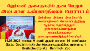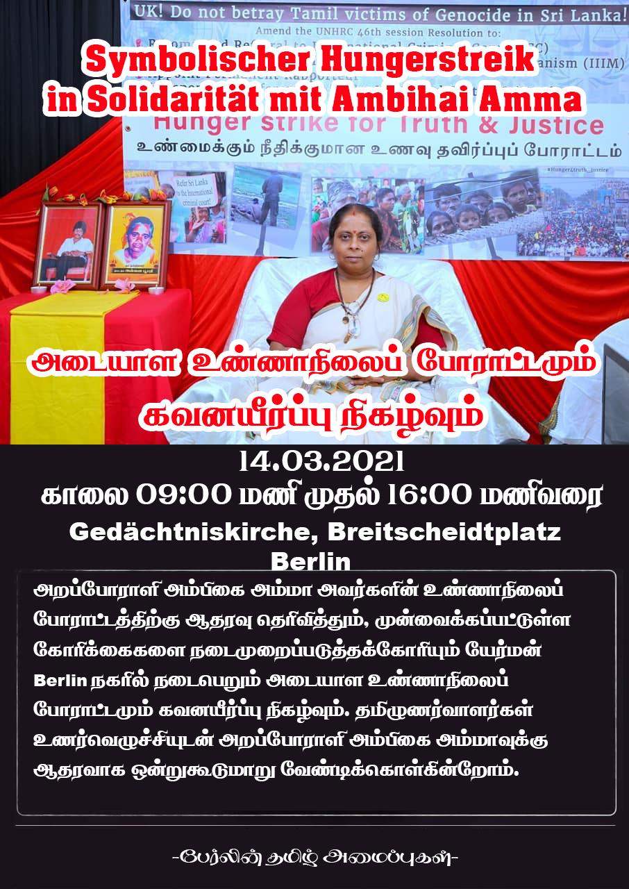 ஜேர்மனி தலைநகரில் நடைபெறும் அடையாள உண்ணாநிலைப் போராட்டம்!!!அறப்போராளி அம்பிகை அம்மா அவர்களின் உண்ணாநிலைப் போராட்டத்திற்கு ஆதரவு தெரிவித்தும் , முன்வைக்கப்பட்டுள்ள கோரிக்கைகளை நடைமுறைப்படுத்தக்கோரியும் யேர்மன் தலைநகரில் நடைபெறும் அடையாள உண்ணாநிலைப் போராட்டமும் கவனயீர்ப்பு நிகழ்வும்.
