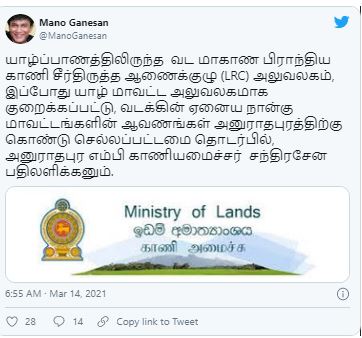இந்த விடயம் தொடர்பாக இன்று (ஞாயிற்றுக்கிழமை) ருவிட்டரில் பதிவிட்டுள்ள மனோ, “யாழ்ப்பாணத்திலிருந்த வட மாகாண பிராந்திய காணி சீர்திருத்த ஆணைக்குழு அலுவலகம், இப்போது யாழ் மாவட்ட அலுவலகமாக குறைக்கப்பட்டு, வடக்கின் ஏனைய நான்கு மாவட்டங்களின் ஆவணங்கள் அனுராதபுரத்திற்கு கொண்டு செல்லப்பட்டமை தொடர்பாக அனுராதபுர நாடாளுமன்ற உறுப்பினர் காணியமைச்சர் சந்திரசேன பதிலளிக்க வேண்டும்” என பதிவிட்டுள்ளார்.