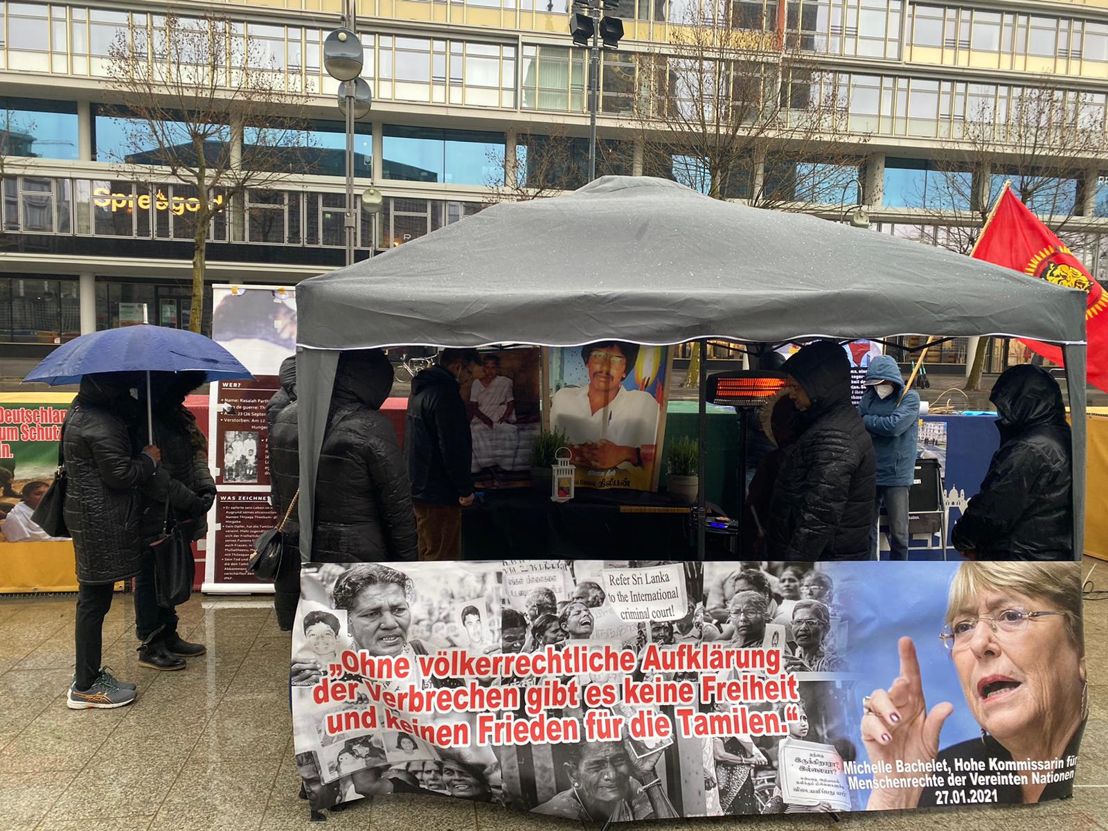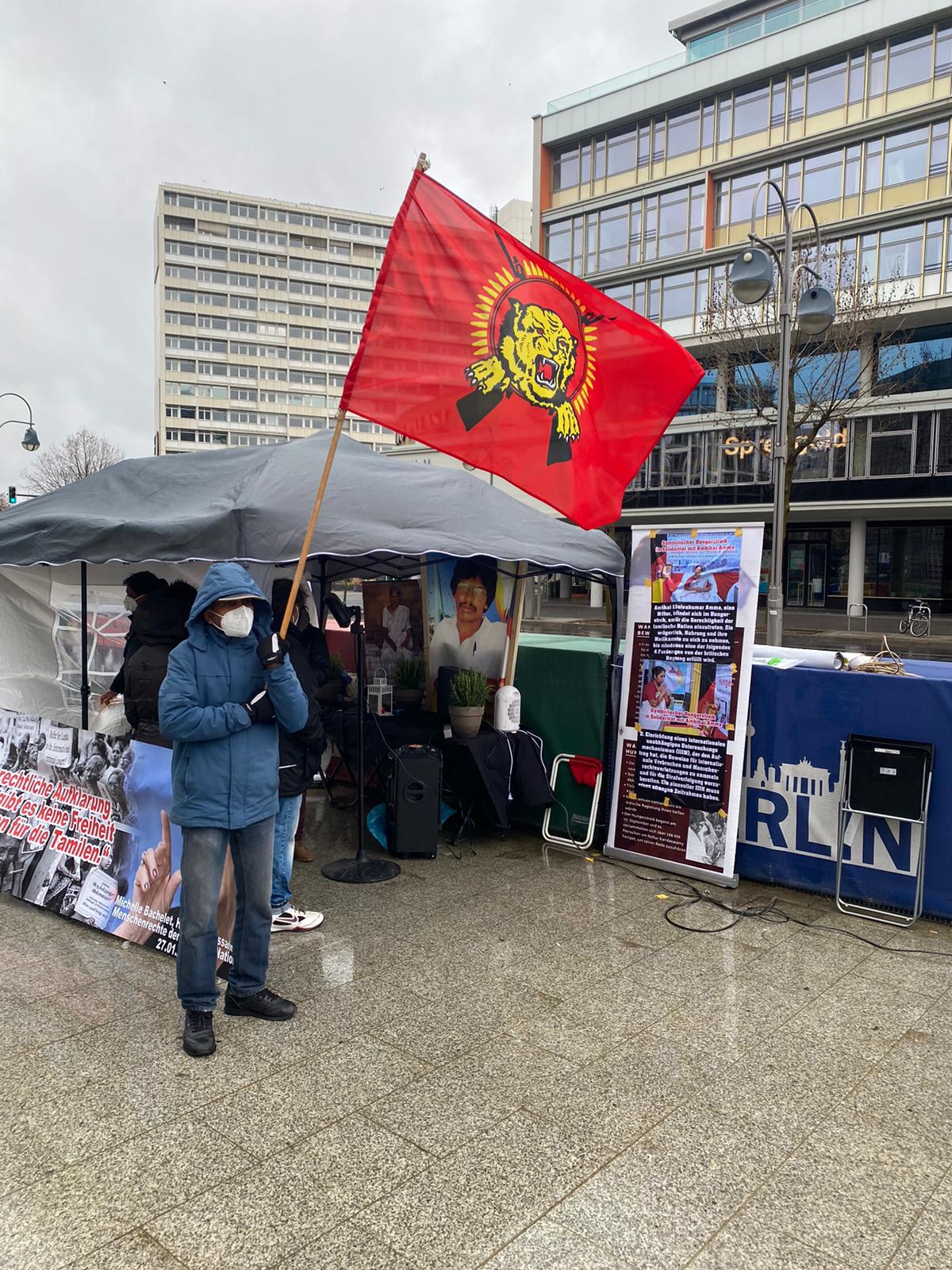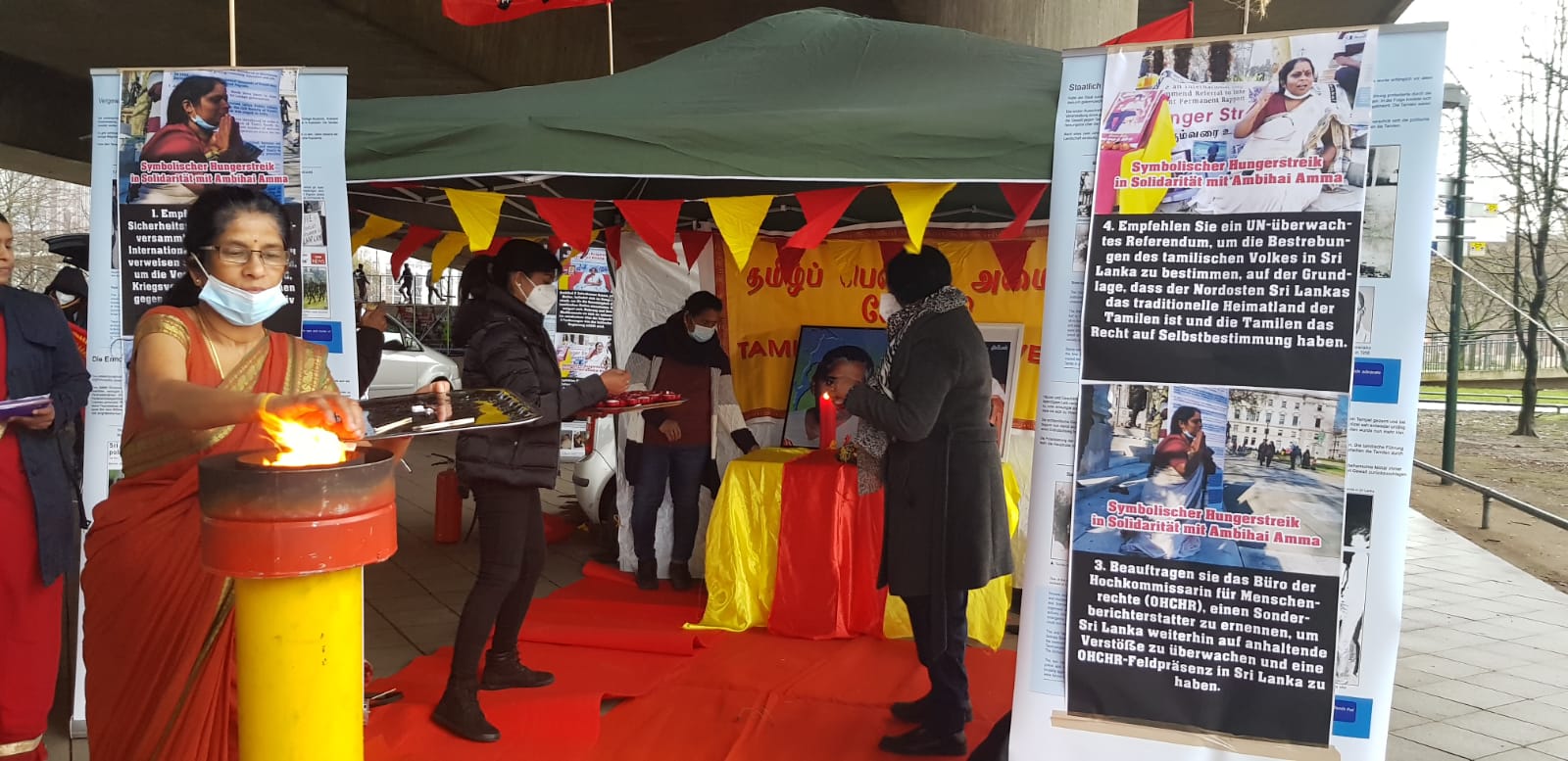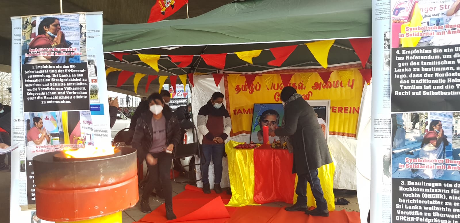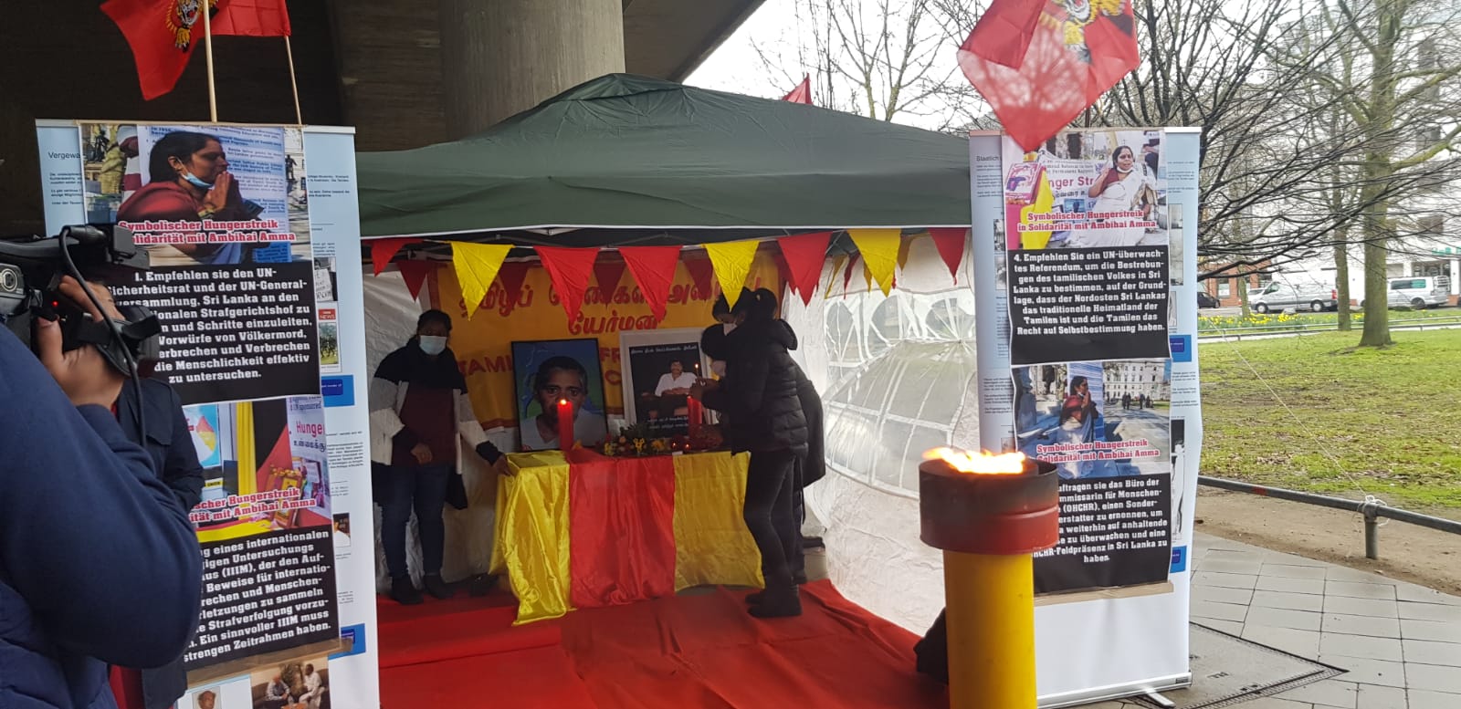 அறப்போராளி அம்பிகை அம்மா அவர்களின் உண்ணாநிலைப் போராட்டத்திற்கு ஆதரவு தெரிவித்தும் முன்வைக்கப்பட்டுள்ள கோரிக்கைகளை நடைமுறைப்படுத்தக்கோரியும் யேர்மன் தலைநகர் பேர்லின் மற்றும் டுசில்டோர்ப் நகரங்களில் நடைபெற்றுக் கொண்டிருக்கும் அடையாள உண்ணாநிலைப் போராட்டமும் கவனயீர்ப்பு நிகழ்வும். நான்கு அம்சக் கோரிக்கைகளை முன்வைத்து லண்டனில் சாகும்வரை உண்ணா நிலைப் போராட்டத்தைத் தொடர்ந்து கடைப்பிடித்துக் கொண்டிருக்கும் அம்பிகை அம்மாவுக்கு ஆதரவு தெரிவிப்பதோடு,