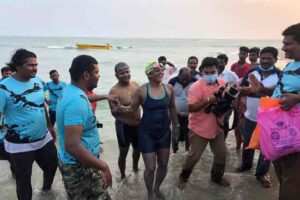 இந்நிலையில், பல்வேறு நீச்சல்போட்டிகளில் சாதனை படைத்த தெலுங்கானா மாநிலம் ஹைதராபாத்தைச் சேர்ந்த சியாமளா கோலி (வயது-48), தலைமன்னாரில் இருந்து தனுஸ்கோடி வரையிலான சுமார் 30 கி.மீ. தூரம் கொண்ட பாக் ஜலசந்தி கடற்பகுதியை நீந்தி சாதனை படைத்தார்.
