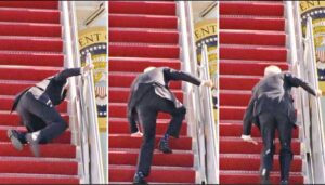 முன்னதாக அவர் விமான படிக்கட்டுகளில் ஏறும்போது திடீரென நிலை தடுமாறினார். எனினும் கீழே விழாமல் படிக்கட்டில் கையை வைத்து எழுந்து நின்றார். சமாளித்துக்கொண்டு மீண்டும் படியேற முயன்ற, 2-வது முறையும் தடுமாறினார். ஆனாலும் எந்த சலனமும் இன்றி மீண்டும் படிக்கட்டுகளில் தொடர்ந்து ஏற முயன்ற, 3-வது முறையும் தடுமாறினார். ஆனால் இம்முறை அவர் படிக்கட்டில் விழுந்தே விட்டார். விழுந்து, எழுந்து, பாவம்போல முழங்கால்களை தடவிக்கொண்டு, தொடர்ந்து ஏறி விமானத்தின் கதவுக்கருகே நின்று, ஒரு சல்யூட் வைத்துவிட்டு உள்ளே சென்றார். ஜோ பைடன் 3 முறை தடுமாறியும், 3-வது முறை விழுந்தும் யாரும் அவருக்கு உதவவில்லை.