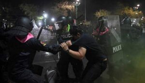 அப்போது போராட்டக்காரர்கள் அரண்மனை வளாகத்துக்குள் நுழைந்து விடாத வண்ணம் போலீசார் தடுப்புகளை ஏற்படுத்தி வைத்திருந்தனர். ஆனால் போராட்டக்காரர்கள் அந்த தடுப்புகளை தாண்டி செல்ல முற்பட்டதால் அவர்களுக்கும் போலீசாருக்கும் இடையே தள்ளுமுள்ளு ஏற்பட்டது. பின்னர் இது மோதலாக வெடித்தது. போராட்டக்காரர்கள் போலீசார் மீது கண்ணாடி பாட்டில்கள் கற்கள் மற்றும் வெடிபொருட்களை வீசி எறிந்து தாக்கினர்.