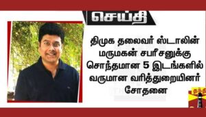 திமுக தலைவர் மு.க.ஸ்டாலினின் மருமகன் சபரீசனுக்கு சொந்தமான 2 அலுவலகம் உள்பட 5 இடங்களில் வருமான வரித்துறையினர் சோதனை நடத்தி வருகின்றனர்.