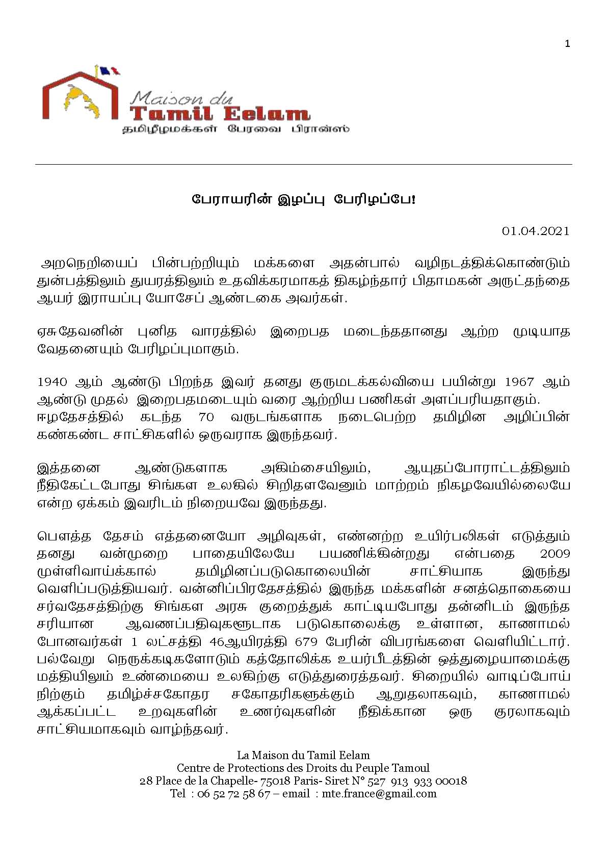 ஈழதேசத்தில் கடந்த 70 வருடங்களாக நடைபெற்ற தமிழின அழிப்பின் கண்கண்ட சாட்சிகளில் ஒருவராக இருந்தவர்.