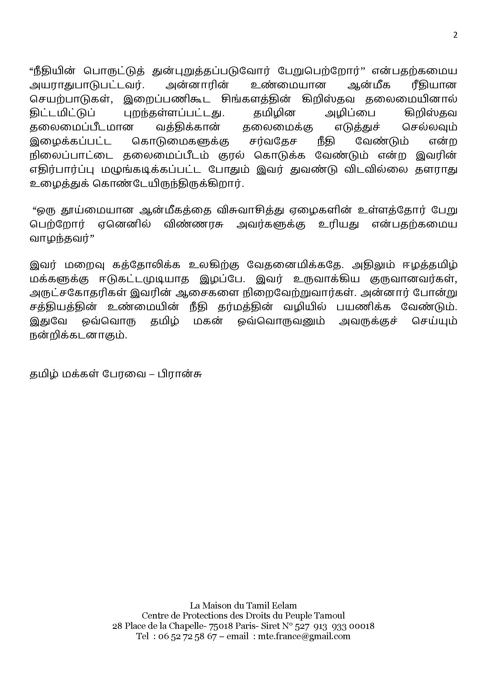 ‘நீதியின் பொருட்டுத் துன்புறுத்தப்படுவோர் பேறுபெற்றோர்” என்பதற்கமைய அயராதுபாடுபட்டவர். அன்னாரின் உண்மையான ஆன்மீக ரீதியான செயற்பாடுகள்இ இறைப்பணிகூட சிங்களத்தின் கிறிஸ்தவ தலைமையினால் திட்டமிட்டுப் புறந்தள்ளப்பட்டது. தமிழின அழிப்பை கிறிஸ்தவ தலைமைப்பீடமான வத்திக்கான் தலைமைக்கு எடுத்துச் செல்லவும் இழைக்கப்பட்ட கொடுமைகளுக்கு சர்வதேச நீதி வேண்டும் என்ற நிலைப்பாட்டை தலைமைப்பீடம் குரல் கொடுக்க வேண்டும் என்ற இவரின் எதிர்பார்ப்பு மழுங்கடிக்கப்பட்ட போதும் இவர் துவண்டு விடவில்லை தளராது உழைத்துக் கொண்டேயிருந்திருக்கிறார்.