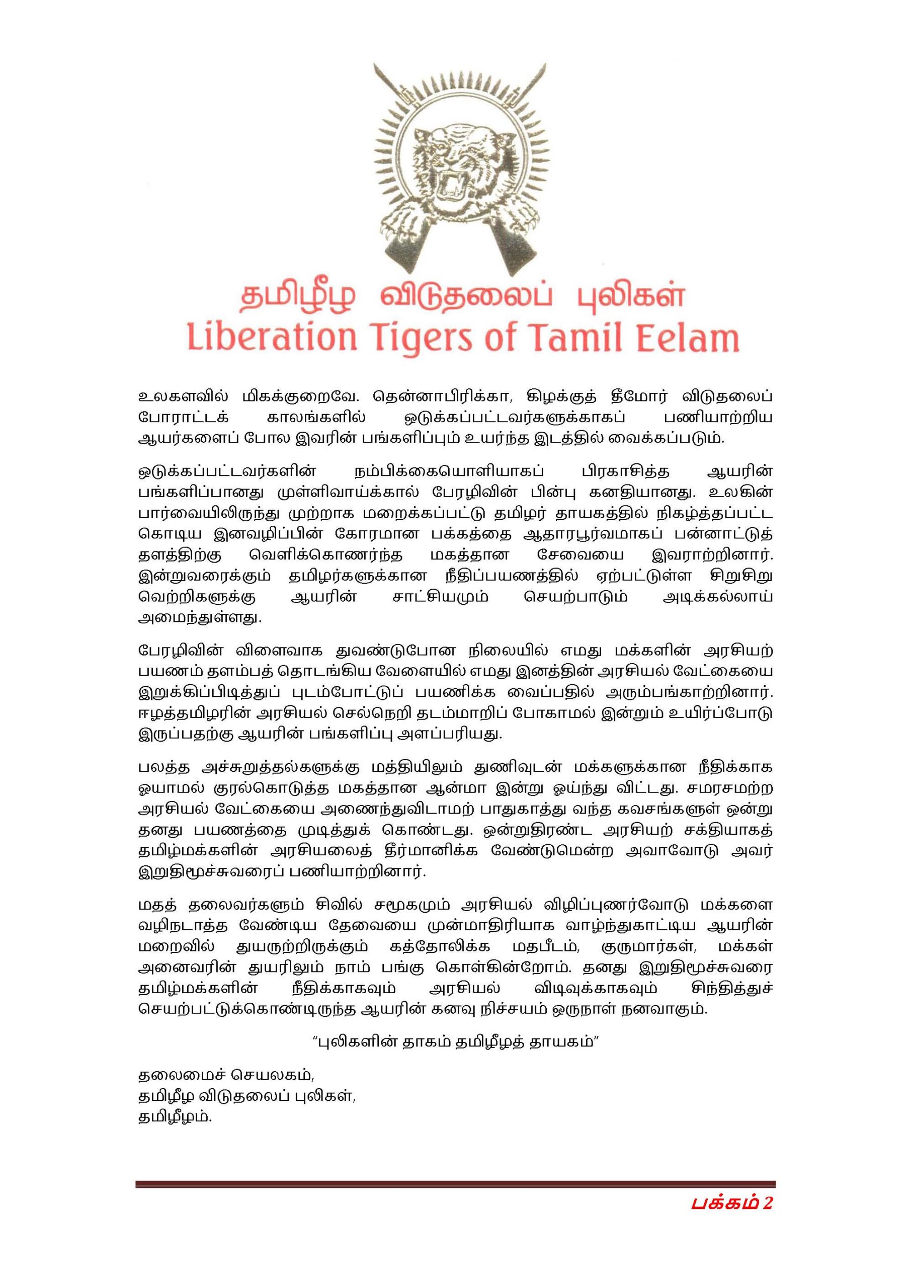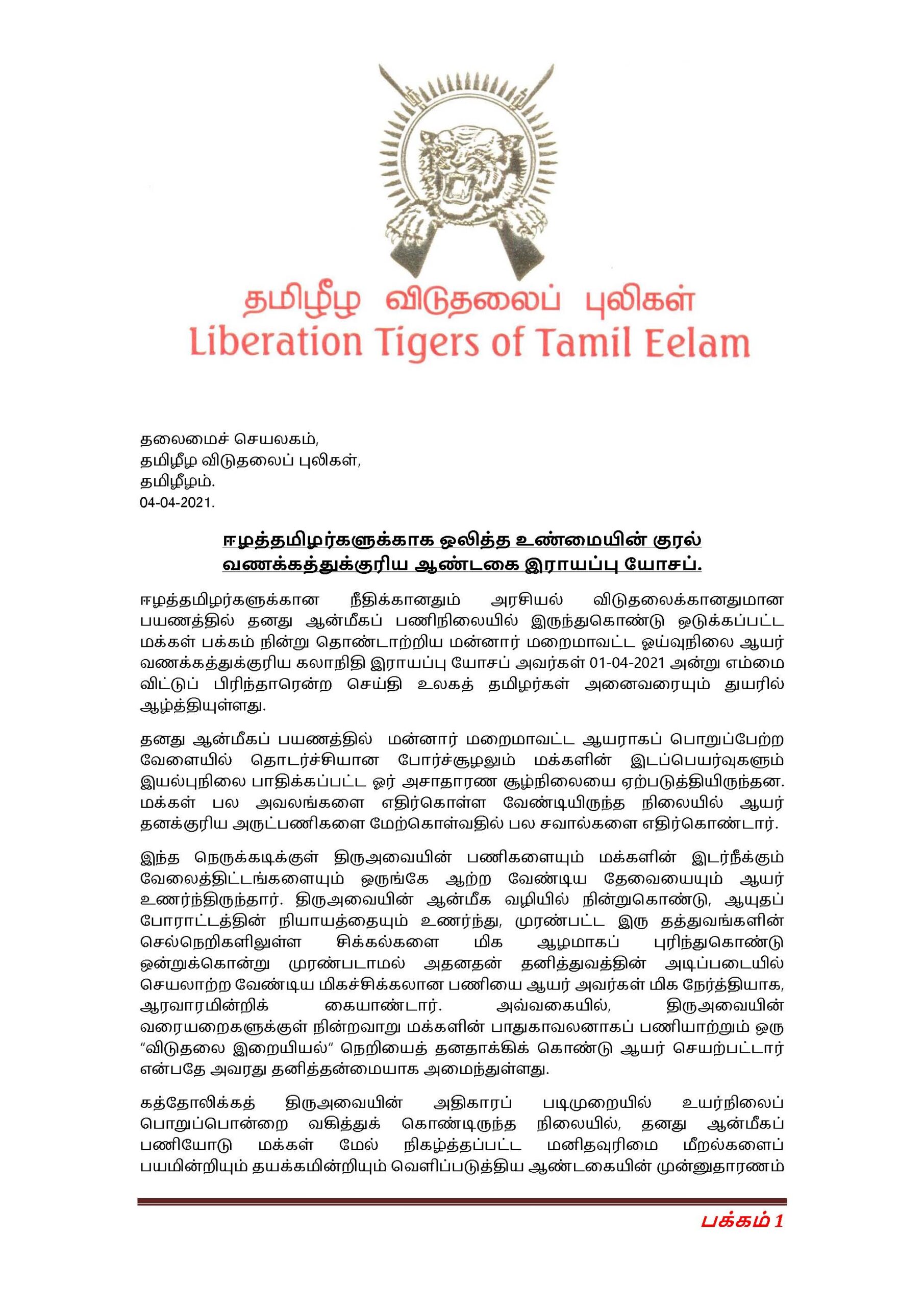 புலம்பெயர் தேசங்களில் முக்கிய செய்திகள் ஈழத்தமிழர்களுக்காக ஒலித்த உண்மையின் குரல் வணக்கத்துக்குரிய ஆண்டகை இராயப்பு யோசப்.- தலைமைச்செயலகம் தமிழீழ விடுதலைப் புலிகள் Posted on April 5, 2021 at 11:13 by சமர்வீரன் 781 0 ஈழத்தமிழர்களுக்காக ஒலித்த உண்மையின் குரல் வணக்கத்துக்குரிய ஆண்டகை இராயப்பு யோசப். தலைமைச்செயலகம் தமிழீழ விடுதலைப் புலிகள்