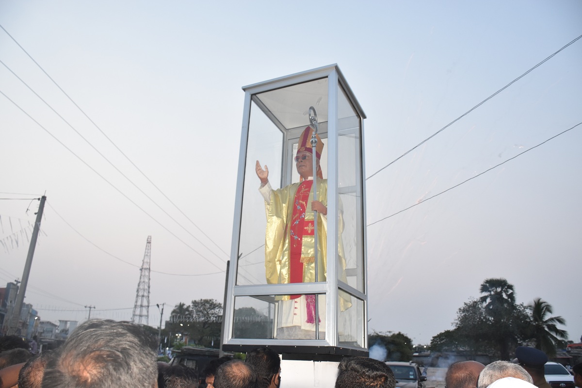 அதனைத் தொடர்ந்து நேற்று ஞாயிற்றுக்கிழமை மாலை 3 மணியளவில் மன்னார் ஆயர் இல்லத்தில் இருந்து மன்னார் தூய செபஸ்தியார் பேராலயத்திற்கு ஊர்தி பவனியூடாக கொண்டு செல்லப்பட்டது.