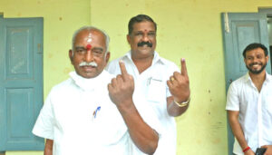 கன்னியாகுமரி பாராளுமன்ற தொகுதிக்கான இடைத்தேர்தல் இன்று நடந்தது. அந்த தொகுதியில் பாரதிய ஜனதா கட்சி சார்பில் போட்டியிடும் பொன்.ராதாகிருஷ்ணன், நாகர்கோவில் எஸ்.எல்.பி. பெண்கள் பள்ளியில் நீண்ட வரிசையில் காத்து நின்று தனது வாக்கை பதிவு செய்தார்.