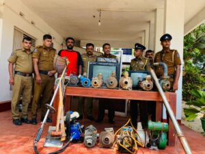 சந்தேக நபர்களிடமிருந்து 15 மின் நீர்ப்பம்பிகள், வாகனங்கள் சுத்திகரிப்புக்குப் பயன்படுத்தப்படும் மோட்டர், புள்ளுவெட்டி இயந்திரம் உள்ளிட்ட பெறுமதியான பொருட்கள் கைப்பற்றப்பட்டுள்ளதாகவும் பொலிஸார் கூறினர்.