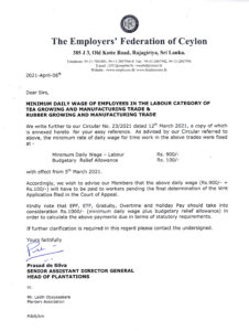 மற்றுமொரு தரப்பான தொழிற்சங்க கூட்டமைப்பினரிடமிருந்து எந்த சத்தத்தையும் காணவில்லை. கூட்டு ஒப்பந்த பேச்சு வார்த்தைகளில் ஒன்றாக அமர்ந்து பேசி தொழிலாளர் சம்பளத்தை தீர்மானிக்கும் இந்த தரப்பினர் தற்போது சம்பள நிர்ணய சபைக்கு ; விவகாரம் சென்றவுடன் வெளியிலிருந்து அறிக்கை போர் செய்து கொண்டிருக்கின்றனர் ஆனால் இந்த விவகாரத்தை பொறுமையோடு அவதானித்துக்கொண்டிருக்கும் தொழிலாளர்களுக்கு இதுவரையிலும் எவரும் நன்றி கூறவில்லை.