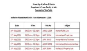 இந்நிலையில் யாழ்ப்பாண பல்கலை கழக சட்ட பீட மாண்வர்களுக்கன பரீட்சைகள் எதிர்வரும் திங்கட்கிழமை ஆரம்பமாகும் என பரீட்சை நேர சூசி வெளியிடப்பட்டுள்ளது.
