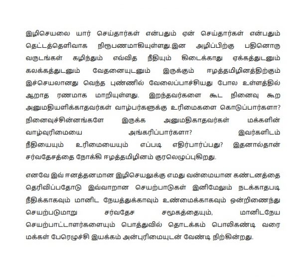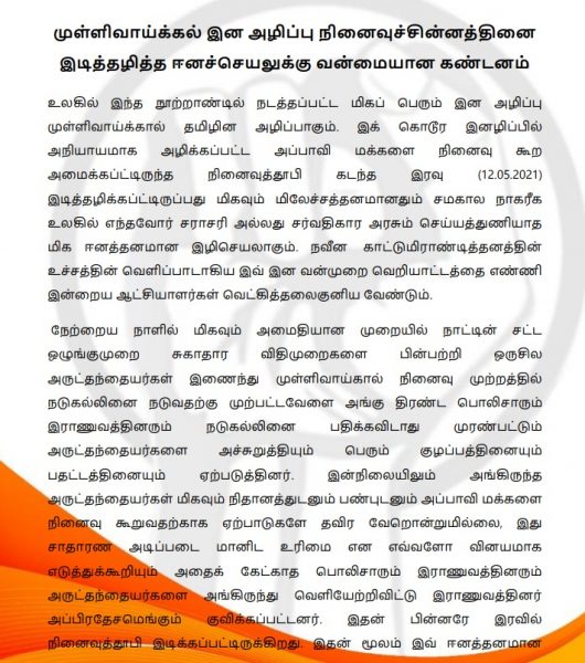 போரில் உயிரிழந்தவர்களை நினைவு கூர்ந்து முல்லைத்தீவு- முள்ளிவாய்க்கால் பகுதியில் அமைக்கப்பட்டிருந்த நினைவேந்தல் முற்றம் சேதப்படுத்தப்பட்டுள்ளமைக்கு கண்டனம் தெரிவித்து பொத்துவில் தொடக்கம் பொலிகண்டி வரை மக்கள் பேரெழுச்சி இயக்கம் வெளியிட்டுள்ள ஊடக அறிக்கையிலேயே இவ்வாறு குறிப்பிட்டுள்ளது.