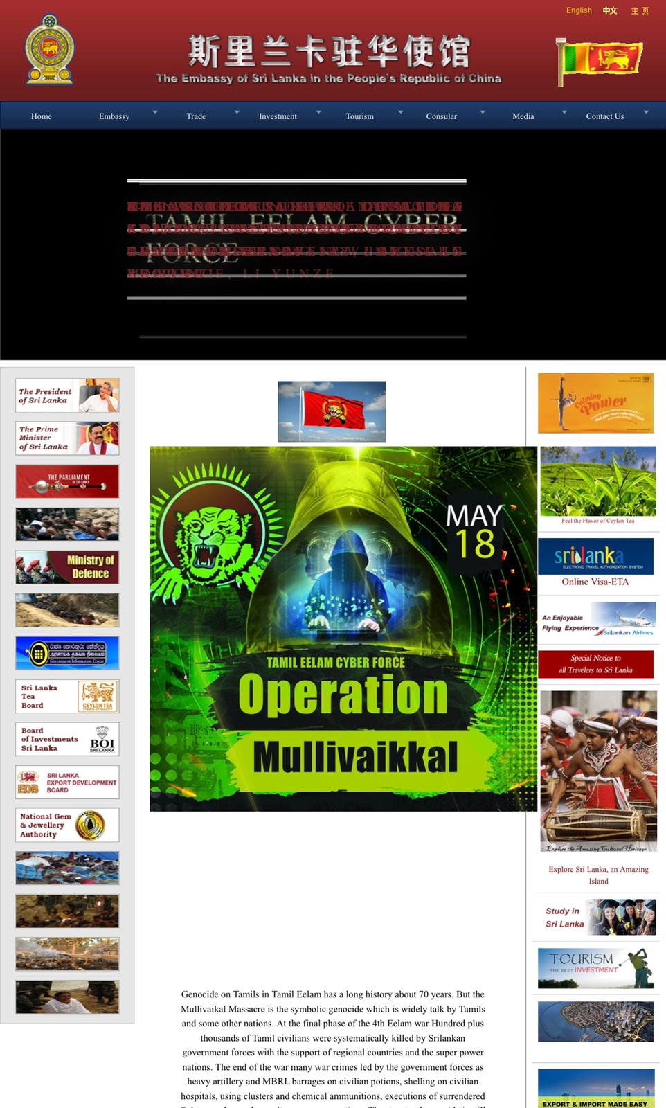 மே18 முள்ளிவாய்க்கால் தமிழின அழிப்பு நாளான இன்று ஒப்பரேசன் முள்ளிவாய்க்கால் என்கின்ற பெயரில் சிறிலங்காவின் அமைச்சரவை அலுவலக குடியரசு இணையம் , துதூவராலயங்கள் இணையத்தளங்கள், சிறிலங்கா அரசநிர்வாக இணையங்கள் மற்றும் சிறிலங்கா அரச ஆதரவான செய்தி ஊடக இணையங்கள் உட்பட 300க்கும் மேற்பட்ட சிறிலங்கா இணையத்தளங்களை ஊடுருவி அந்த தளங்களில் முள்ளிவாய்க்கால் இனப்படுகொலைப் படங்களை பதிவேற்றியும் அதை நாம் மறக்க மாட்டோம் எனவும் செய்தி பதிவிட்டுள்ளனர்.