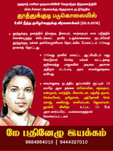 தூத்துக்குடி ஸ்டெர்லைட் தாமிர உருக்காலையை மூடக்கோரி அமைதி வழியில் நடந்த போராட்டத்தில் அரச பயங்கரவாதத்தால் உயிரிழந்த 15 தமிழர்களுக்கு வீரவணக்கம்! – மே பதினேழு இயக்கம்