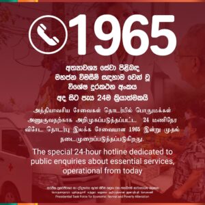அதன்படி பிரதமரின் மஹிந்த ராஜபக்ஷவின் ஆலோசனையின் பேரில் அலரி மாளிகையில் பசில் ராஜபக்ஷவின் தலைமையில் ஜனாதிபதி செயலணியின் கீழ் அத்தியாவசிய சேவைகள் தொடர்பான பொது பிரச்சினைகளை தெரிவிப்பதற்கு 1965 என்ற புதிய ஹாட்லைன் இலக்கம் அறிமுகப்படுத்தப்பட்டுள்ளது.