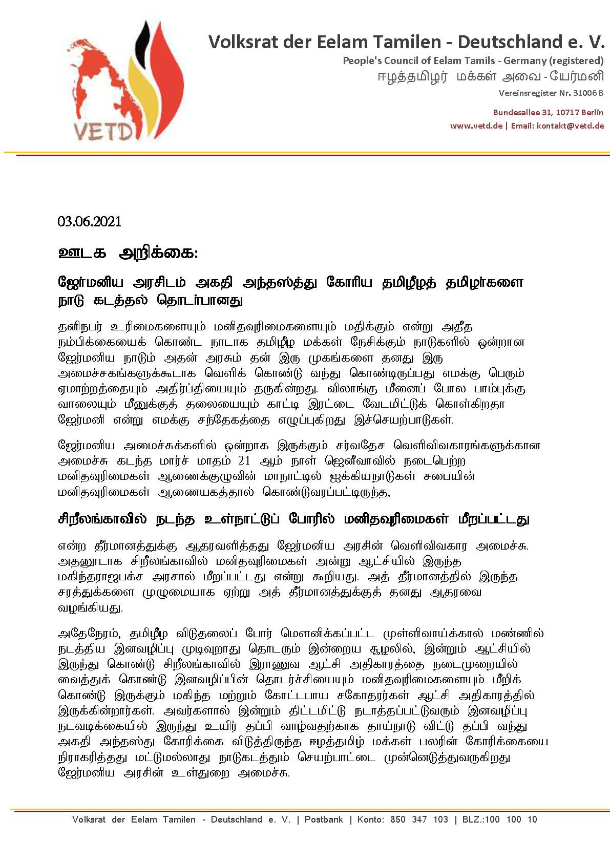 அதேநேரம், தமிழீழ விடுதலைப் போர் மௌனிக்கப்பட்ட முள்ளிவாய்க்கால் மண்ணில் நடத்திய இனவழிப்பு முடிவுறாது தொடரும் இன்றைய சூழலில், இன்றும் ஆட்சியில் இருந்து கொண்டு சிறீலங்காவில் இராணுவ ஆட்சி அதிகாரத்தை நடைமுறையில் வைத்துக் கொண்டு இனவழிப்பின் தொடர்ச்சியையும் மனிதவுரிமைகளையும் மீறிக் கொண்டு இருக்கும் மகிந்த மற்றும் கோட்டபாய சகோதரர்கள் ஆட்சி அதிகாரத்தில் இருக்கின்றார்கள். அவர்களால் இன்றும் திட்டமிட்டு நடாத்தப்பட்டுவரும் இனவழிப்பு நடவடிக்கையில் இருந்து உயிர் தப்பி வாழ்வதற்காக தாய்நாடு விட்டு தப்பி வந்து அகதி அந்தஸ்து கோரிக்கை விடுத்திருந்த ஈழத்தமிழ் மக்கள் பலரின் கோரிக்கையை நிராகரித்தது மட்டுமல்லாது நாடுகடத்தும் செயற்பாட்டை முன்னெடுத்துவருகிறது ஜேர்மனிய அரசின் உள்துறை அமைச்சு.