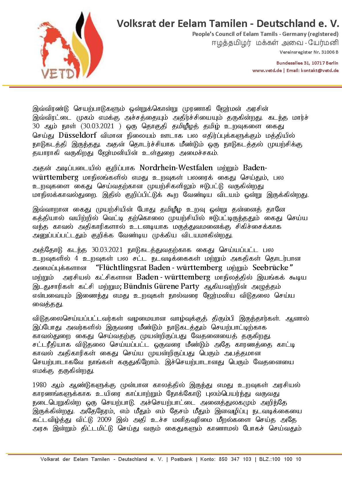 அத்தோடு கடந்த 30.03.2021 நாடுகடத்துவதற்காக கைது செய்யப்பட்ட பல உறவுகளில் 4 உறவுகள் பல சட்ட நடவடிக்கைகள் மற்றும் அகதிகள் தொடர்பான அமைப்புக்களான “Flüchtlingsrat Baden – württemberg மற்றும் Seebrücke ” மற்றும் அரசியல் கட்சிகளான Baden – württemberg மாநிலத்தில் இயங்கக் கூடிய இடதுசாரிகள் கட்சி மற்றும் Bündnis Gürene Party ஆகியவற்றின் அழுத்தம் என்பவை அனைத்தும் இணைந்து எமது உறவுகள் நால்வரை ஜேர்மனிய விடுதலை செய்ய வைத்தது.