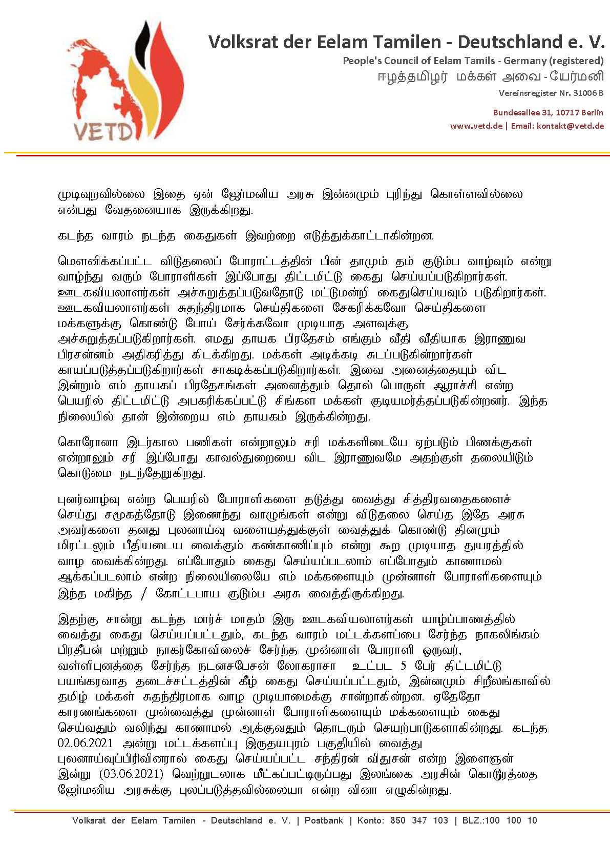 இதற்கு சான்று கடந்த மார்ச் மாதம் இரு ஊடகவியலாளர்கள் யாழ்ப்பாணத்தில் வைத்து கைது செய்யப்பட்டதும், கடந்த வாரம் மட்டக்களப்பை சேர்ந்த நாகலிங்கம் பிரதீபன் மற்றும் நாகர்கோவிலைச் சேர்ந்த முன்னாள் போராளி ஒருவர், வள்ளிபுனத்தை சேர்ந்த நடனசபேசன் லோகராசா உட்பட 5 பேர் திட்டமிட்டு பயங்கரவாத தடைச்சட்டத்தின் கீழ் கைது செய்யப்பட்டதும், இன்னமும் சிறீலங்காவில் தமிழ் மக்கள் சுதந்திரமாக வாழ முடியாமைக்கு சான்றாகின்றன. ஏதேதோ காரணங்களை முன்வைத்து முன்னாள் போராளிகளையும் மக்களையும் கைது செய்வதும் வலிந்து காணாமல் ஆக்குவதும் தொடரும் செயற்பாடுகளாகின்றது. கடந்த 02.06.2021 அன்று மட்டக்களப்பு இருதயபுரம் பகுதியில் வைத்து புலனாய்வுப்பிரிவினரால் கைது செய்யப்பட்ட சந்திரன் விதுசன் என்ற இளைஞன் இன்று (03.06.2021) வெற்றுடலாக மீட்கப்பட்டிருப்பது இலங்கை அரசின் கொடூரத்தை ஜேர்மனிய அரசுக்கு புலப்படுத்தவில்லையா என்ற வினா எழுகின்றது.