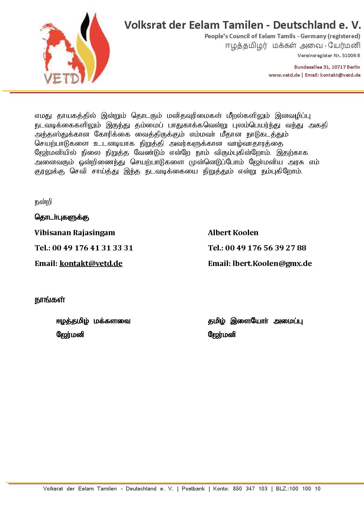 எமது தாயகத்தில் இன்றும் தொடரும் மனிதவுரிமைகள் மீறல்களிலும் இனவழிப்பு நடவடிக்கைகளிலும் இருந்து தம்மைப் பாதுகாக்கவென்று புலம்பெயர்ந்து வந்து அகதி அந்தஸ்துக்கான கோரிக்கை வைத்திருக்கும் எம்மவர் மீதான நாடுகடத்தும் செயற்பாடுகளை உடனடியாக நிறுத்தி அவர்களுக்கான வாழ்வாதாரத்தை ஜேர்மனியில் நிலை நிறுத்த வேண்டும் என்றே நாம் விரும்புகின்றோம். இதற்காக அனைவரும் ஒன்றிணைந்து செயற்பாடுகளை முன்னெடுப்போம் ஜேர்மனிய அரசு எம் குரலுக்கு செவி சாய்த்து இந்த நடவடிக்கையை நிறுத்தும் என்று நம்புகிறோம்.