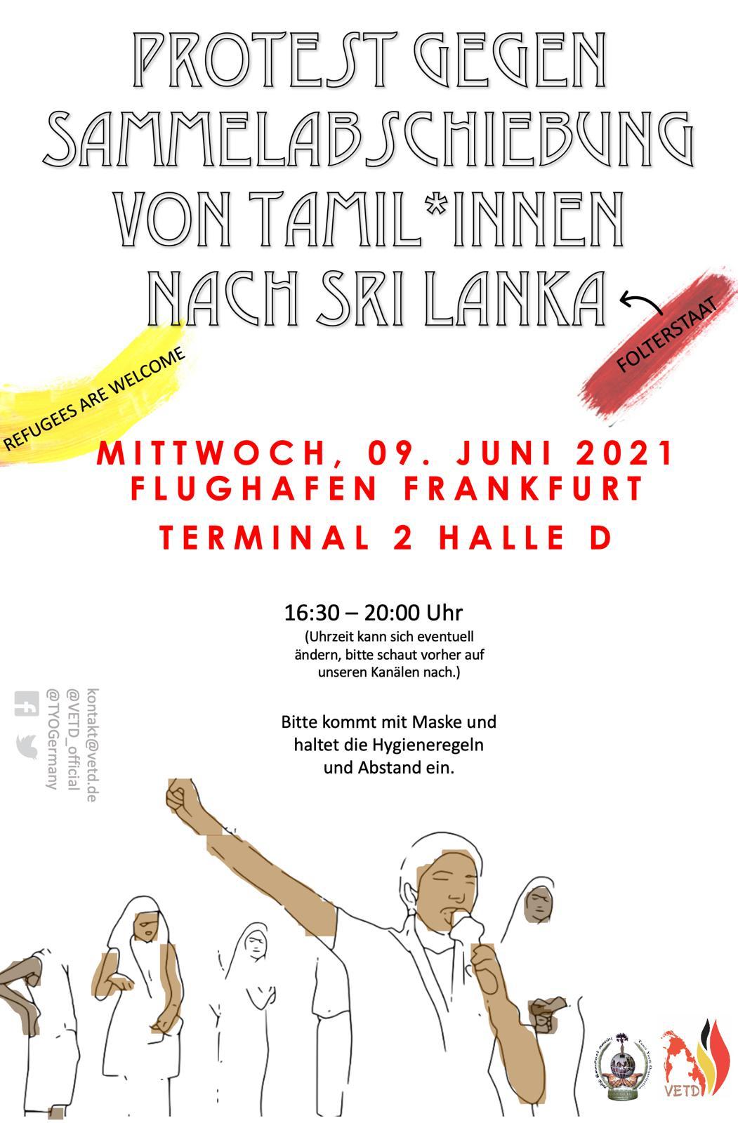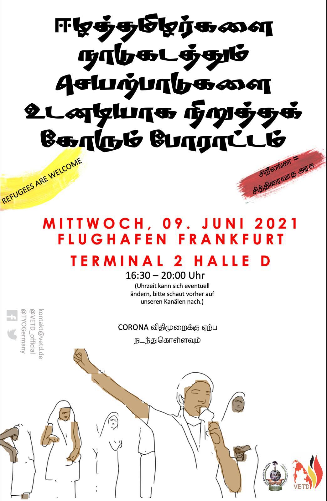 ஈழத்தமிழர்களை நாடுகடத்தும் செயற்பாடுகளை உடனடியாக நிறுத்தக் கோரும் போராட்டம். 9.6.2021 புதன்கழமை யேர்மனி பிராங்போட் சர்வதேச விமான நிலையத்தில் 16.30. தொடக்கம் 20.00 மணி வரை கொலைக்களமாகிய சிறிலங்கா தேசத்துக்கு நாடுகடத்தப்படும் எம் உறவுகளைக் காக்க குரல் கொடும்போம் திரண்டுவாருங்கள் எம் உறவுகளே.