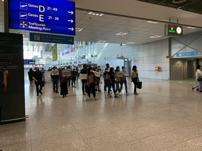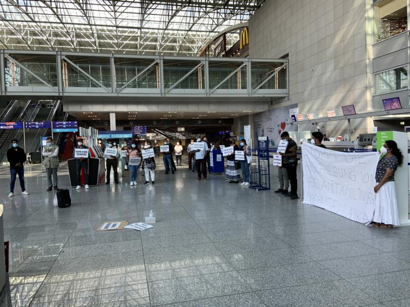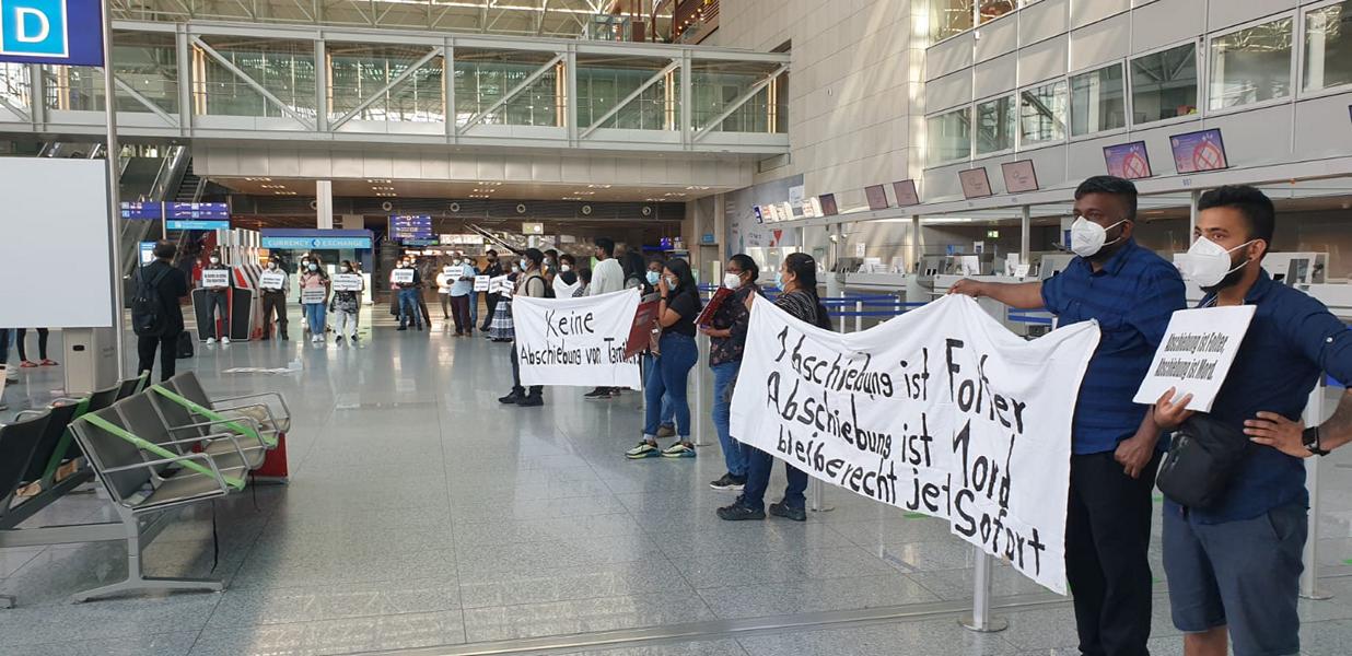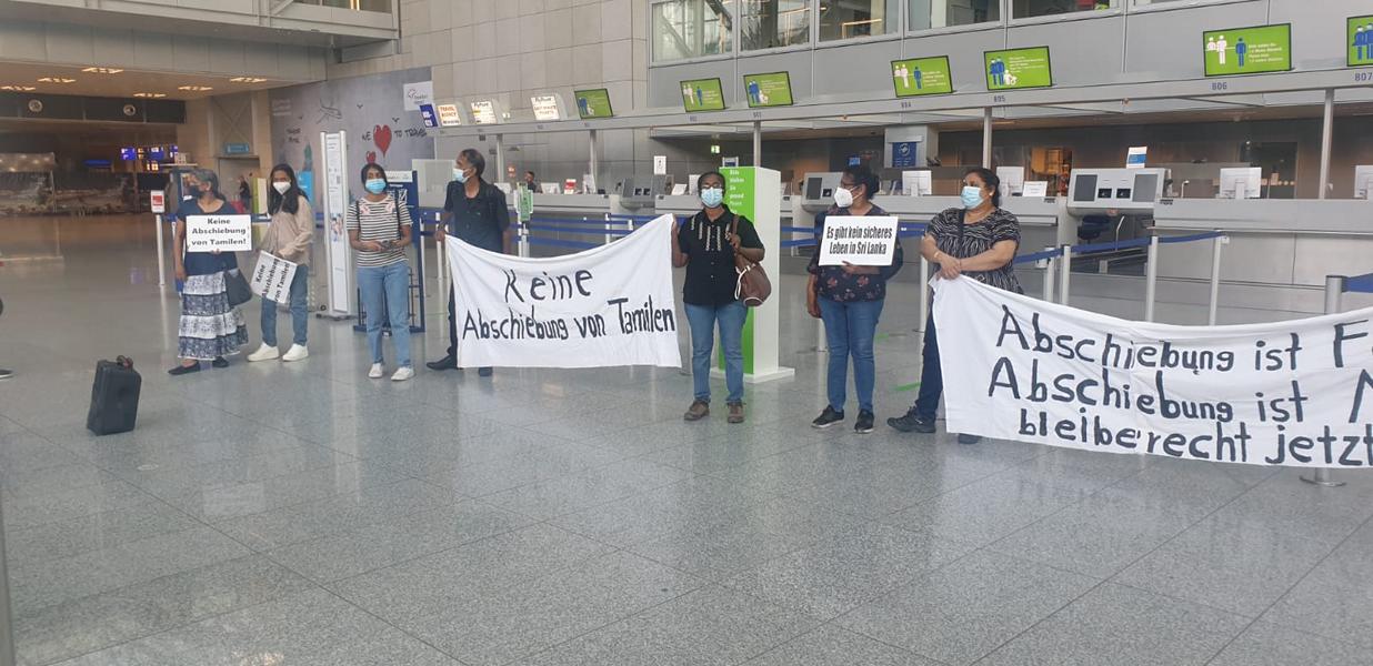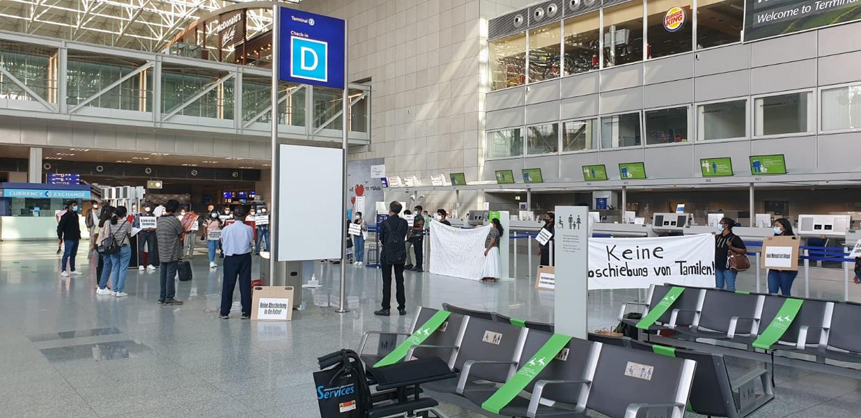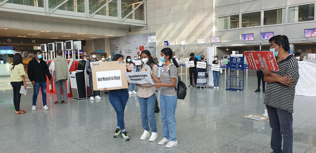 இன்று நாடுகடத்தப்படுவதை இறுதி நேரத்தில் அறிந்த மக்கள் விமான நிலையத்தில் 14.30 மணியளவில் ஒன்றுகூடி ஆர்ப்பாட்டம் செய்தனர். இவர்களுடன் சில யேர்மனிய மக்களும் இணைந்துகொண்டு அரசின் நாடுகடத்தலுக்கு எதிராகக் குரல் கொடுத்தனர்