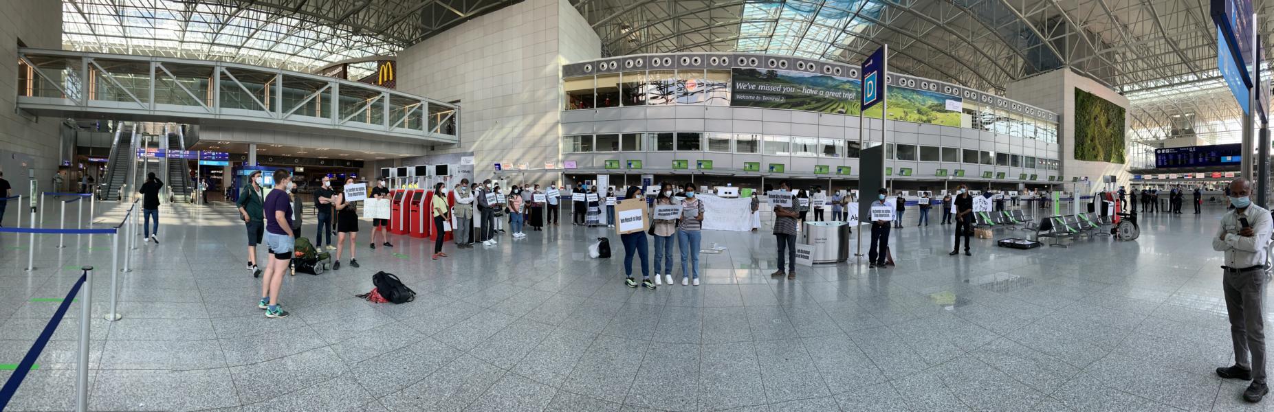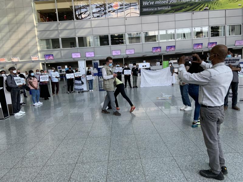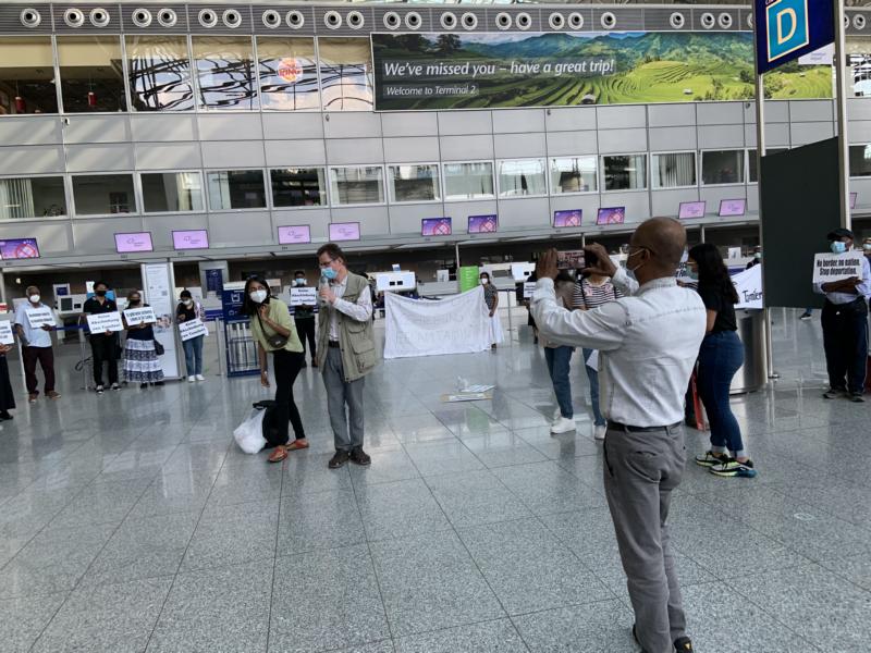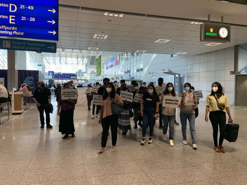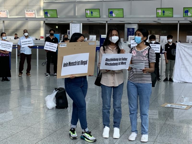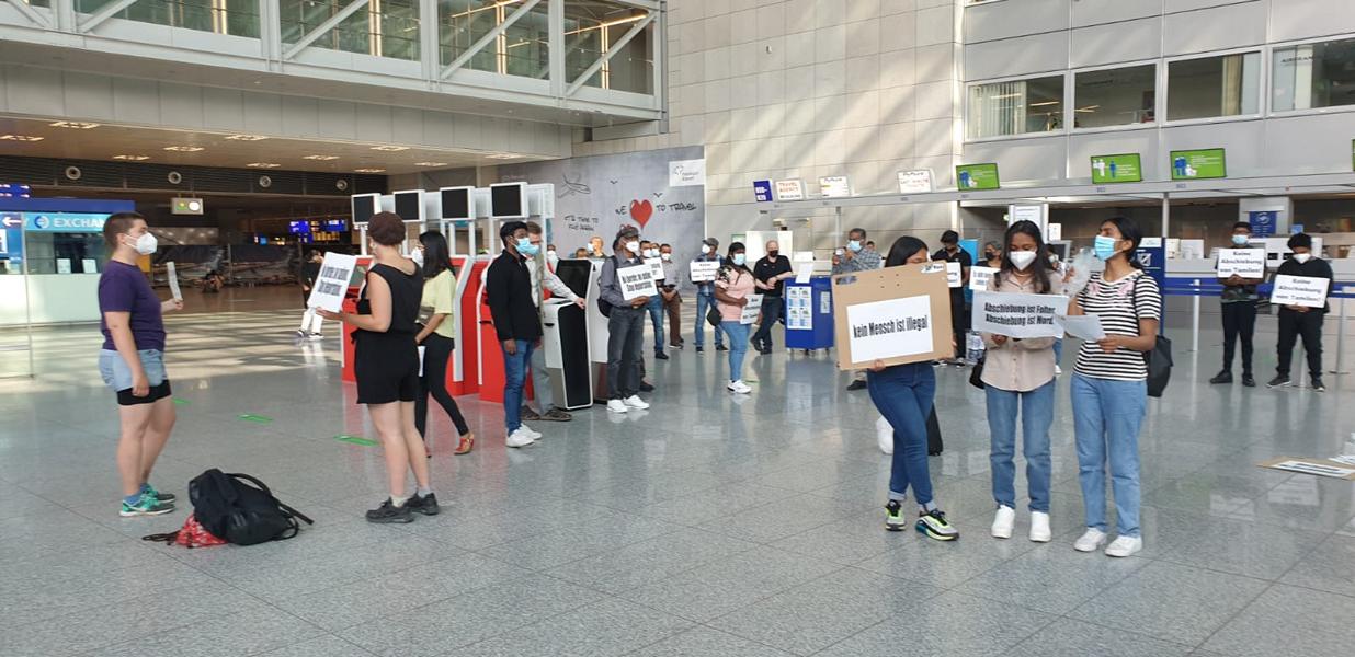 இன்று நாடுகடத்தப்படுவதை இறுதி நேரத்தில் அறிந்த மக்கள் விமான நிலையத்தில் 14.30 மணியளவில் ஒன்றுகூடி ஆர்ப்பாட்டம் செய்தனர். இவர்களுடன் சில யேர்மனிய மக்களும் இணைந்துகொண்டு அரசின் நாடுகடத்தலுக்கு எதிராகக் குரல் கொடுத்தனர்