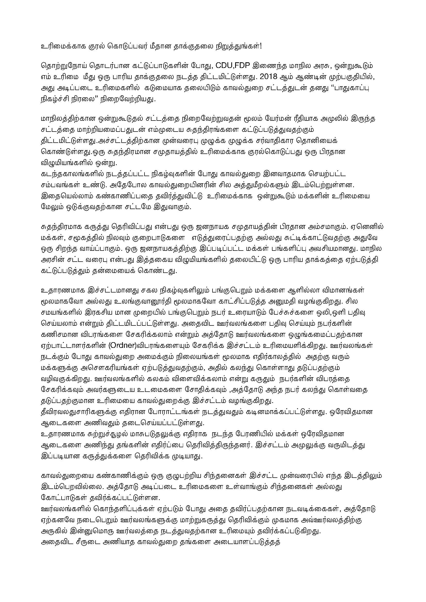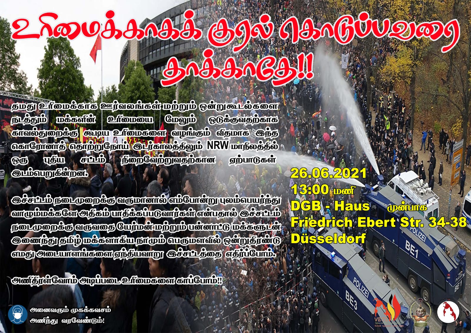 தமது உரிமைக்காக ஊர்வலங்களை மற்றும் ஒன்றுகூடல்களை நடத்தும் மக்களின் உரிமையை மேலும் ஒடுக்குவதற்காக காவல்துறைக்கு கூடுதல் உரிமையை வழங்கும் விதமாக, இந்த கொரோனா தொற்று நோய் இடர்காலத்திலும் NRW மாநிலத்தில் ஒரு புதிய சட்டம் நிறைவேற்றுவதற்கான ஏற்பாடுகள் இடம்பெறுகின்றன.