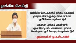 * ஒலிம்பிக் போட்டிகளில் தங்கம் வெல்லும் தமிழக வீரர்களுக்கு அரசு சார்பில் ரூ.3 கோடி வழங்கப்படும்.