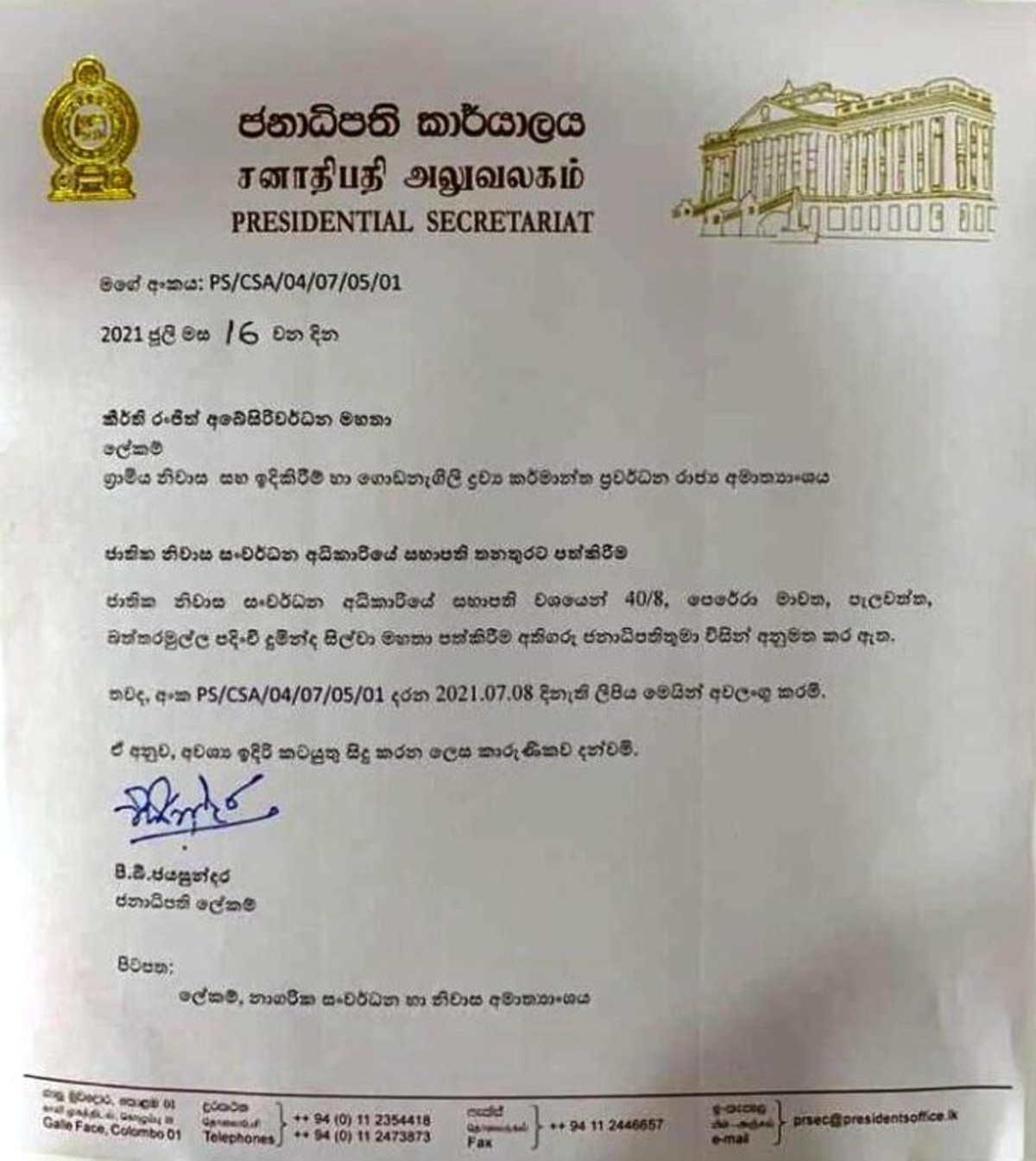இதனையடுத்து, ஜனாதிபதியின் செயலாளர் துமிந்த சில்வாவை தேசிய வீட்மைப்பு அதிகாரசபையின் தலைவராக நியமித்து அனுப்பிய கடிதத்தை கொழும்பு ஆங்கில ஊடகமொன்று வெளியிட்டுள்ளது.