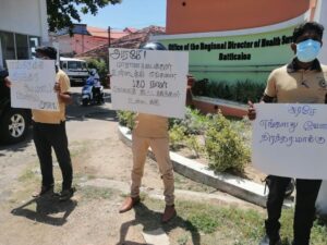 குறித்த ஆர்ப்பாட்டம் மட்டக்களப்பு மாவட்ட பிராந்திய சுகாதார சேவைகள் பணிப்பாளர் அலுவலகத்திற்கு முன்பாக மேற்கொள்ளப்பட்டு வருகிறது.