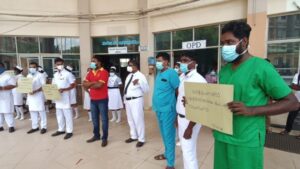 வவுனியா வைத்தியசாலையில் பணிபுரியும் தாதிய உத்தியோகத்தர்களால் வைத்தியசாலை வளாகத்தில் குறித்த ஆர்ப்பாட்டம் முன்னெடுக்கப்பட்டது.